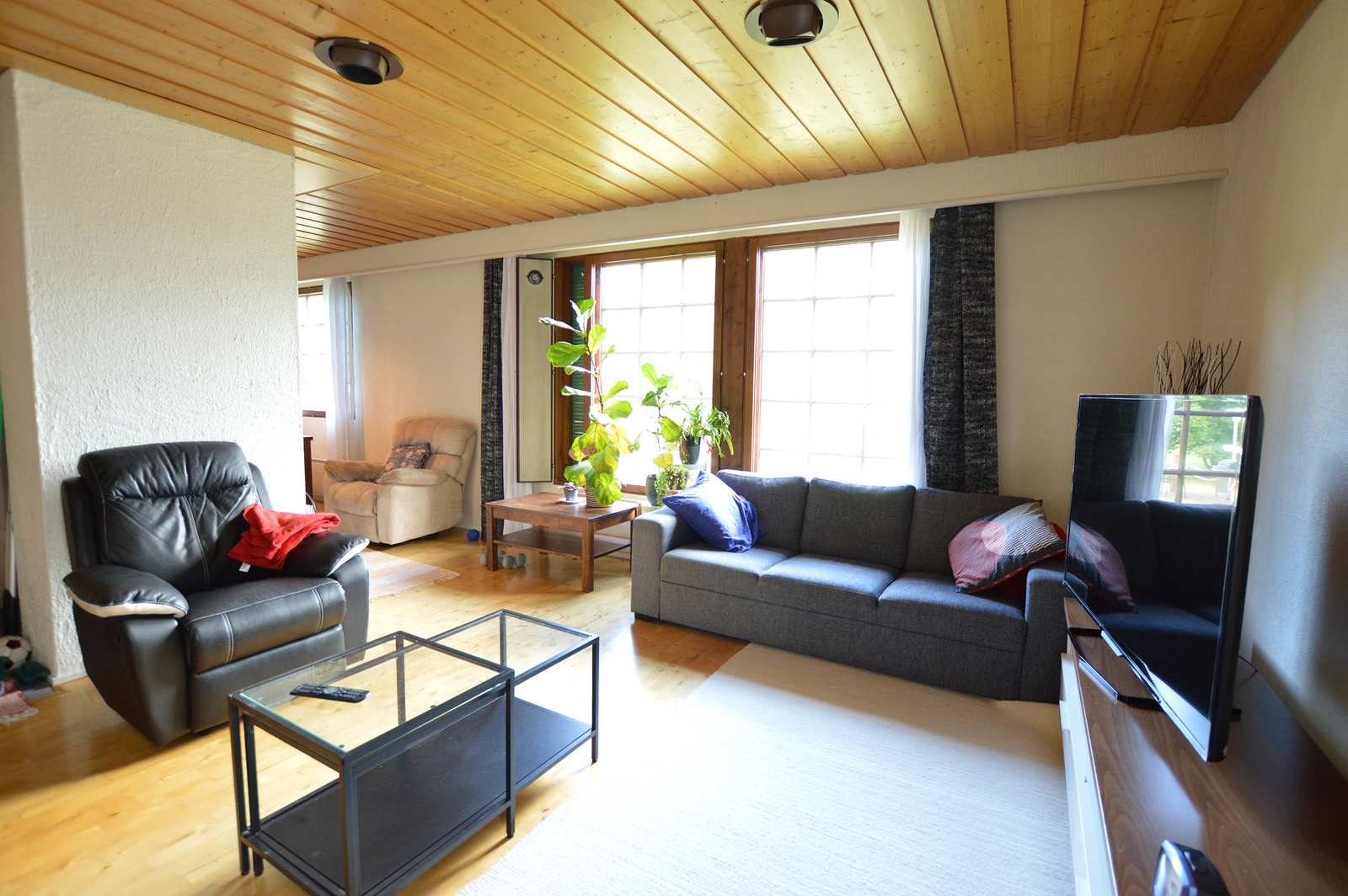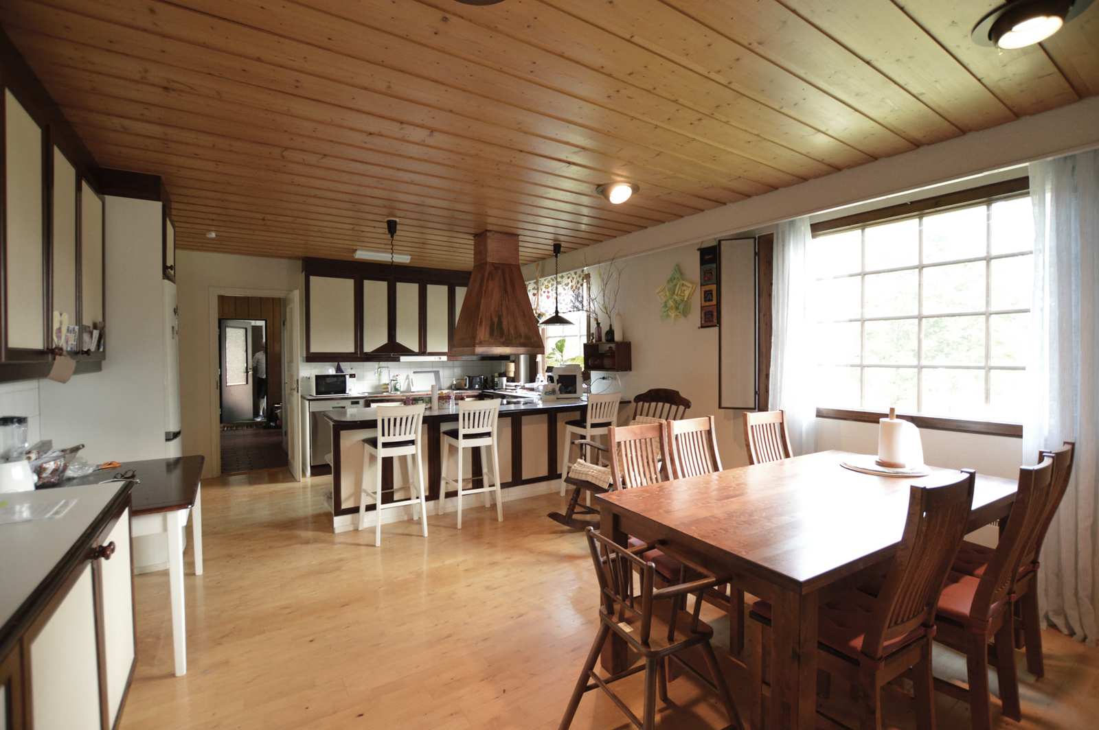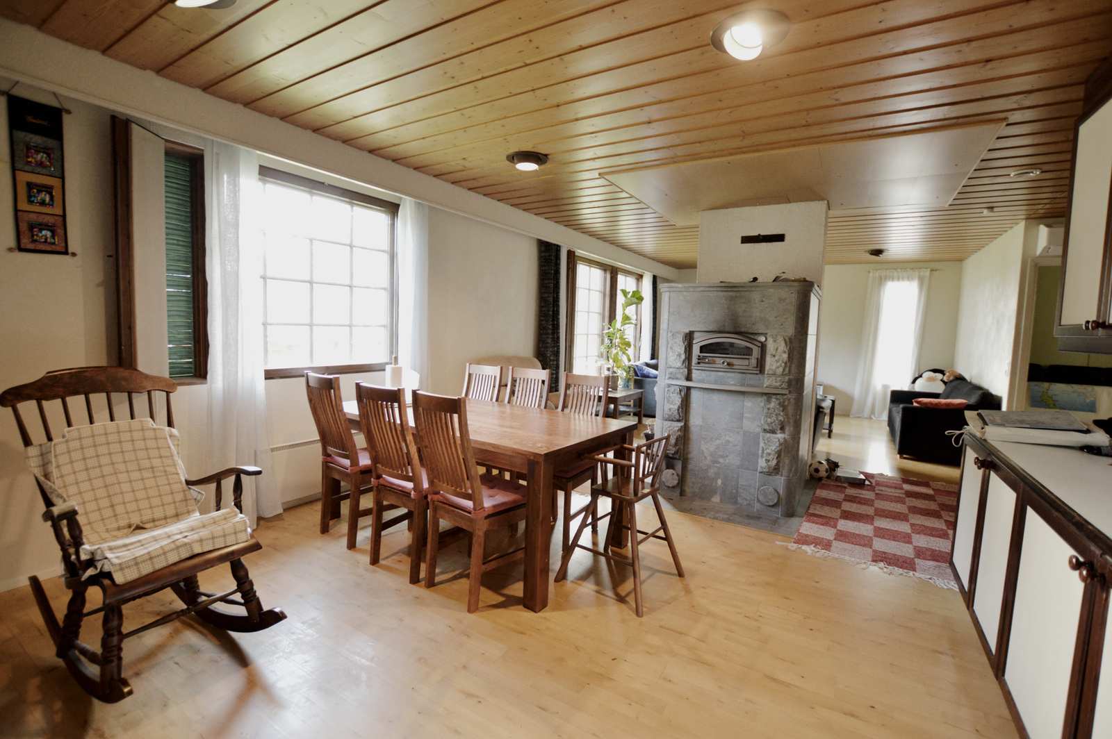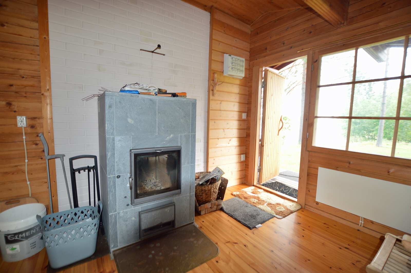 Olohuone | Lattiassa parketti, seinissä maali, katossa puupaneeli. Varaava takka. |
