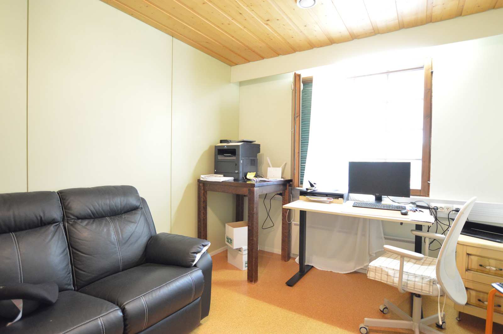 Kodinhoitohuone | Askarteluhuonetta käytetty kodinhoitotilana. Tilassa pyykinpesukoneen liitäntä, useita kaappeja. |