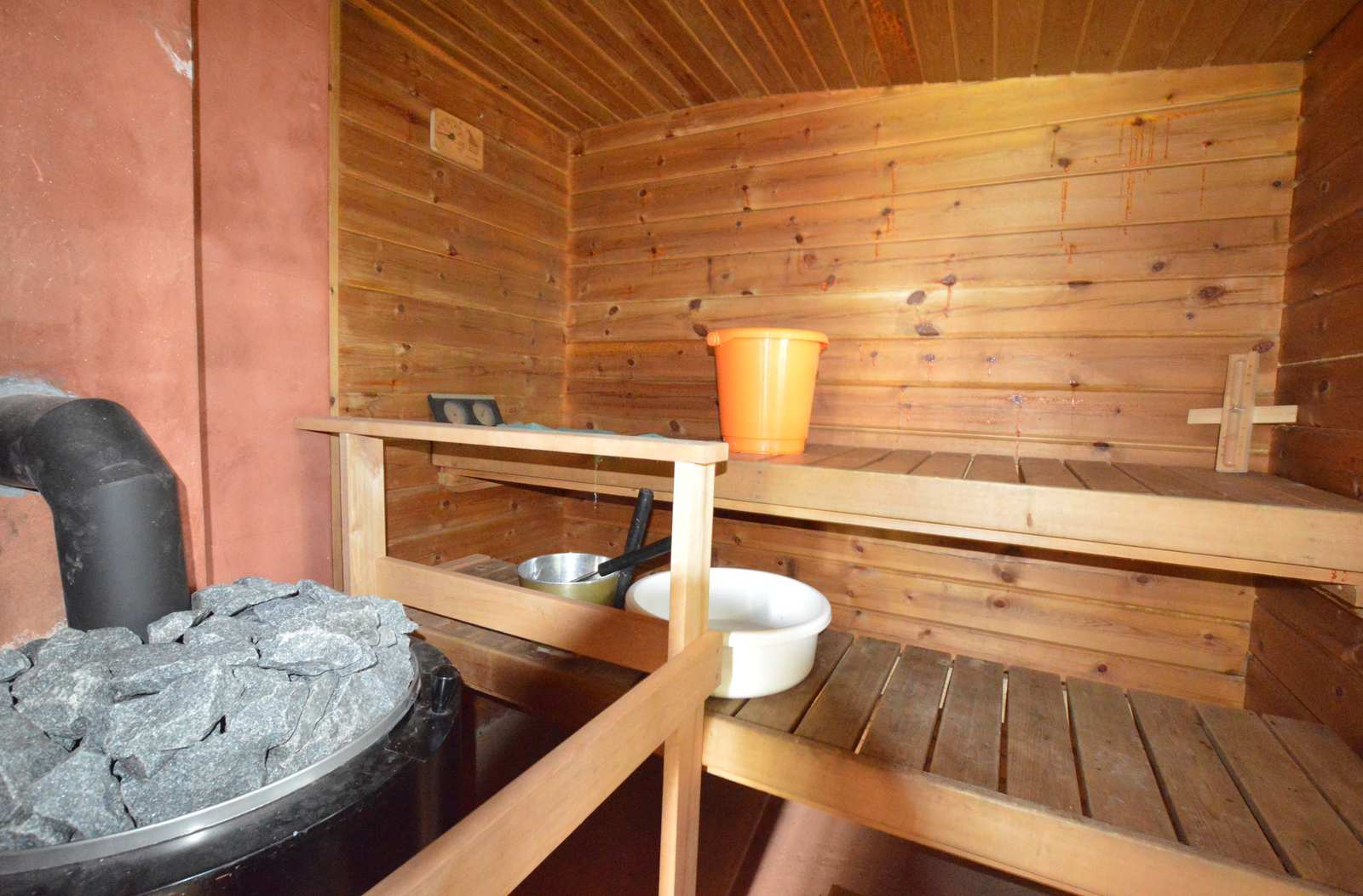 Saunan kuvaus | Sähkökiuas. Lauteiden alla lämminvesivaraaja. |