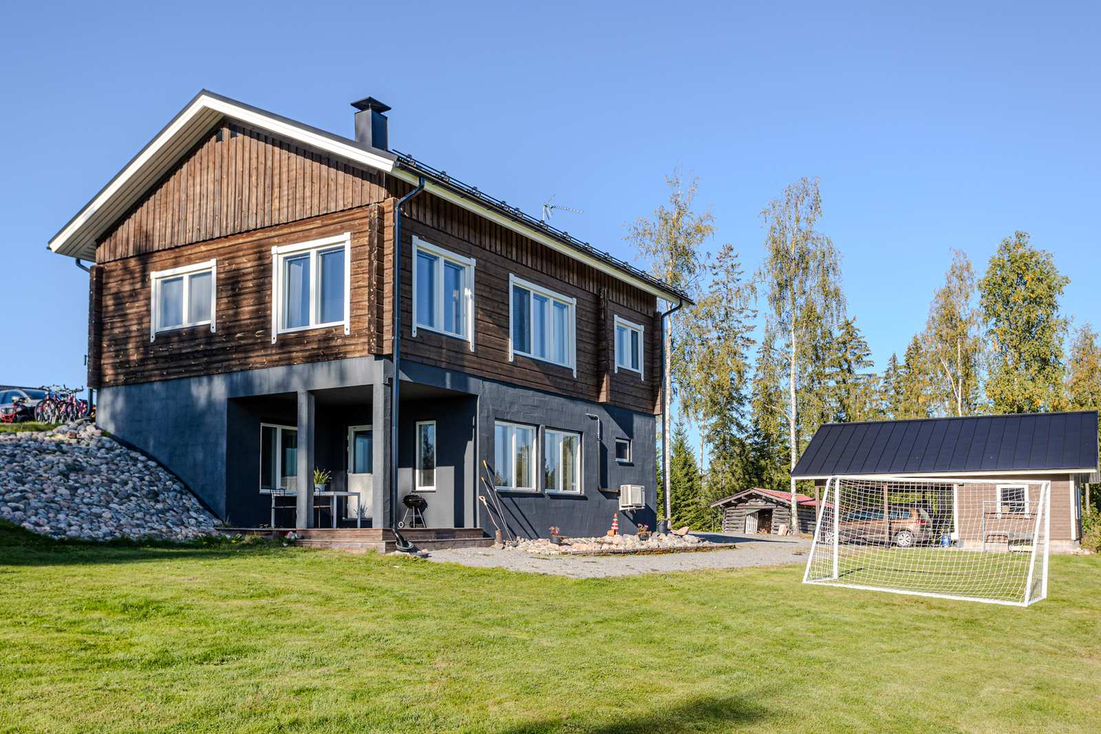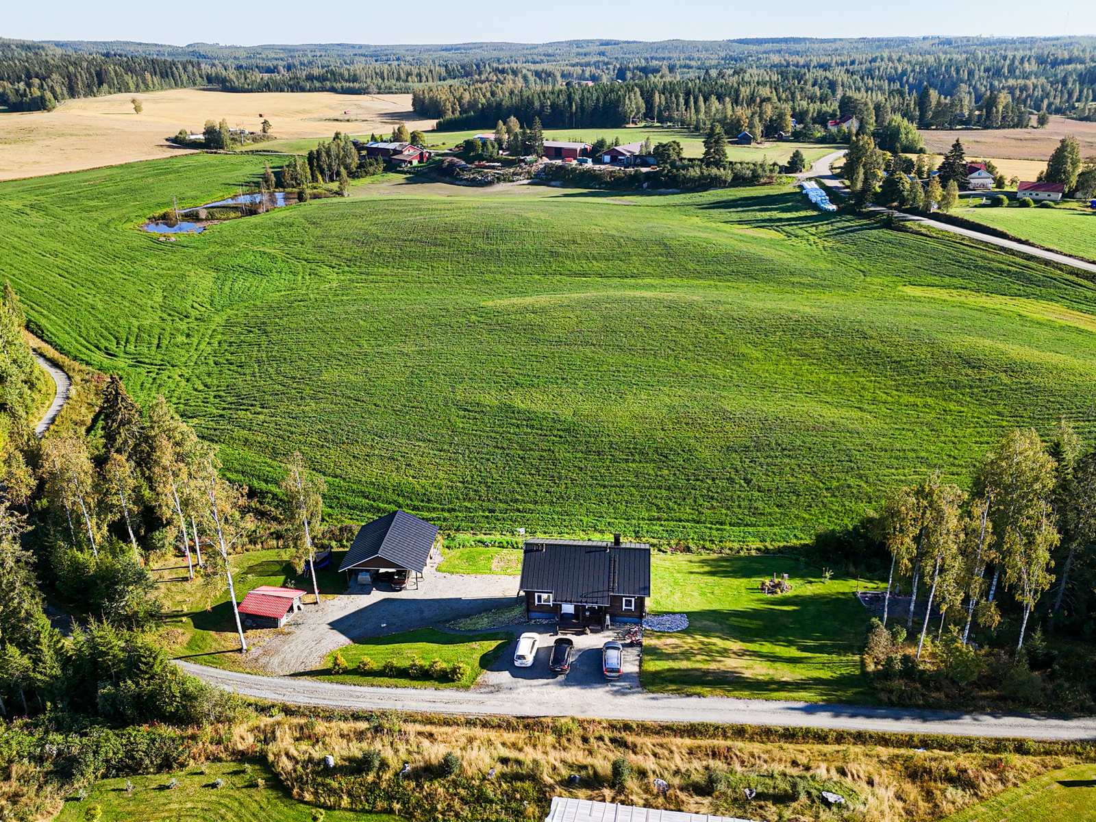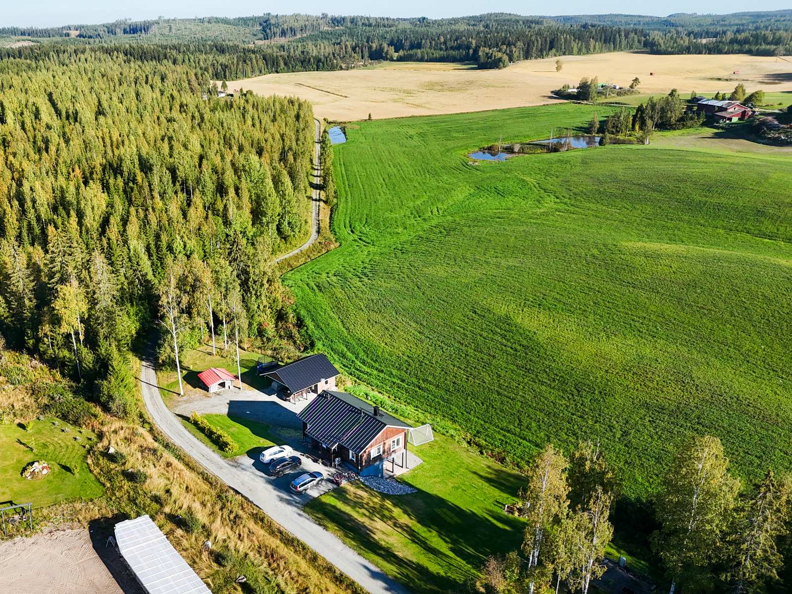 Aidoissa maaseutumaisemissa Pöljän kylän alueella jykevästä lamellihirrestä rakennettu, v. 2014 valmistunut rinnetalo peltoalueen reunassa.