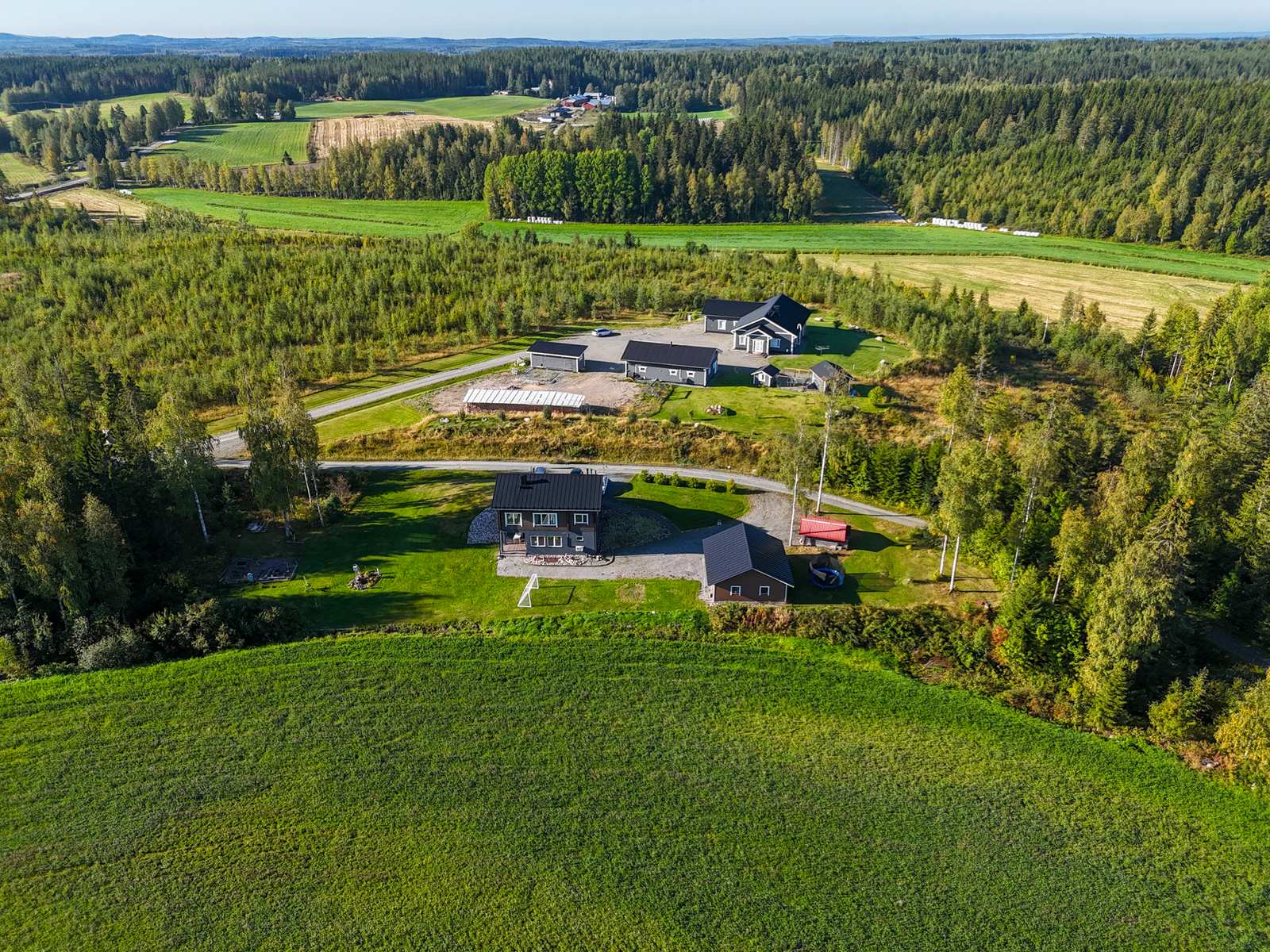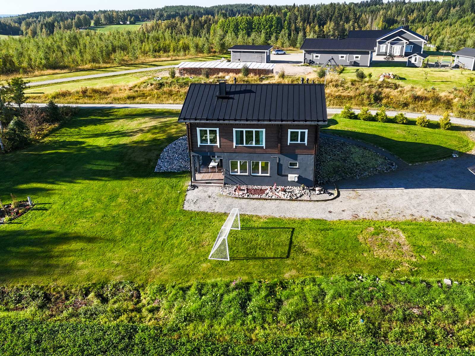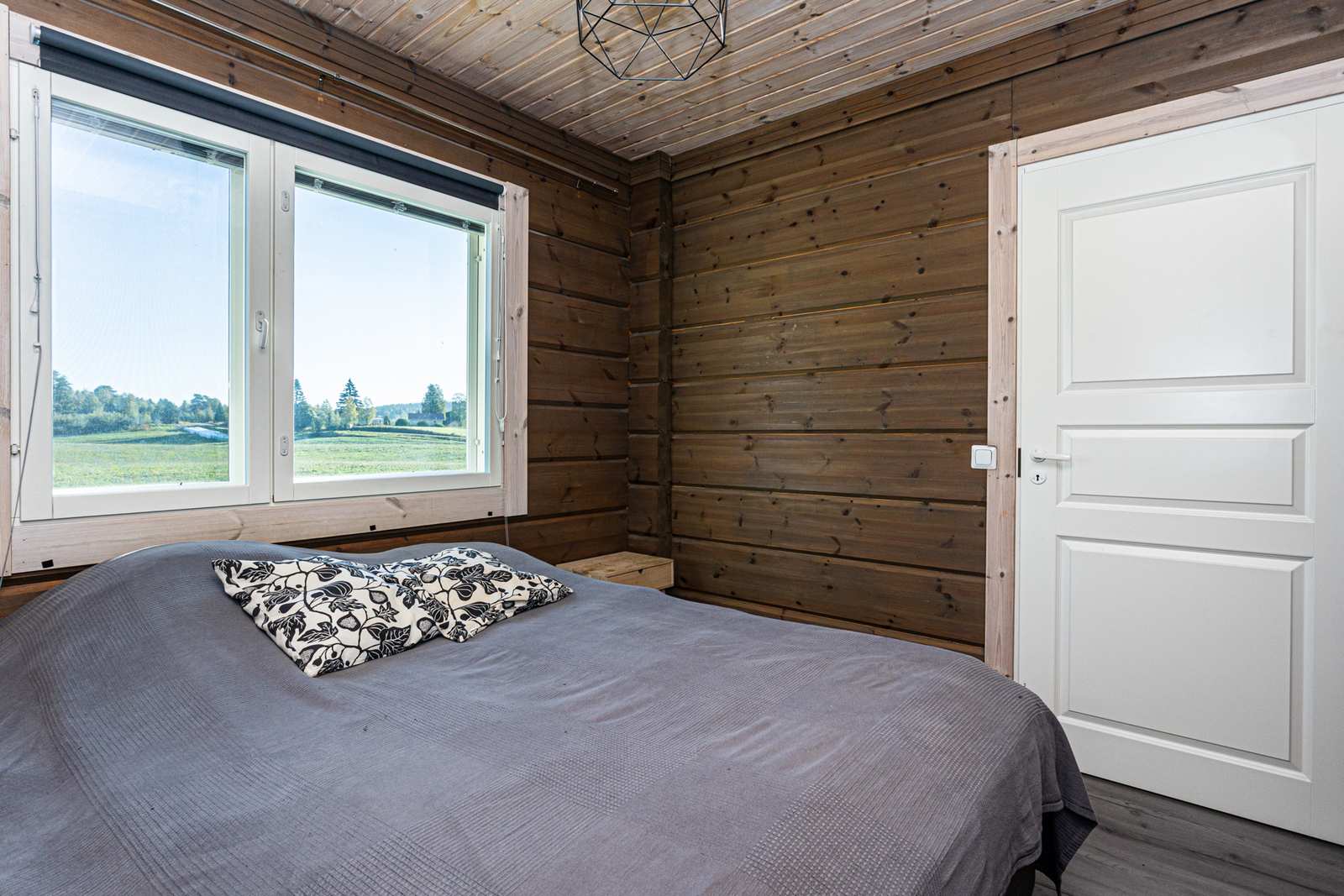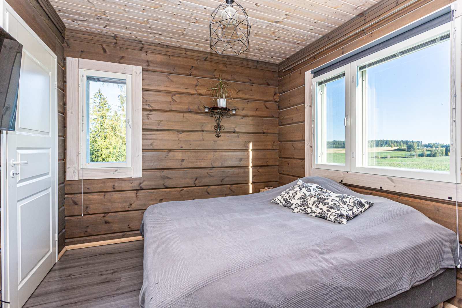Aidoissa maaseutumaisemissa Pöljän kylän alueella jykevästä lamellihirrestä rakennettu, v. 2014 valmistunut rinnetalo peltoalueen reunassa.
