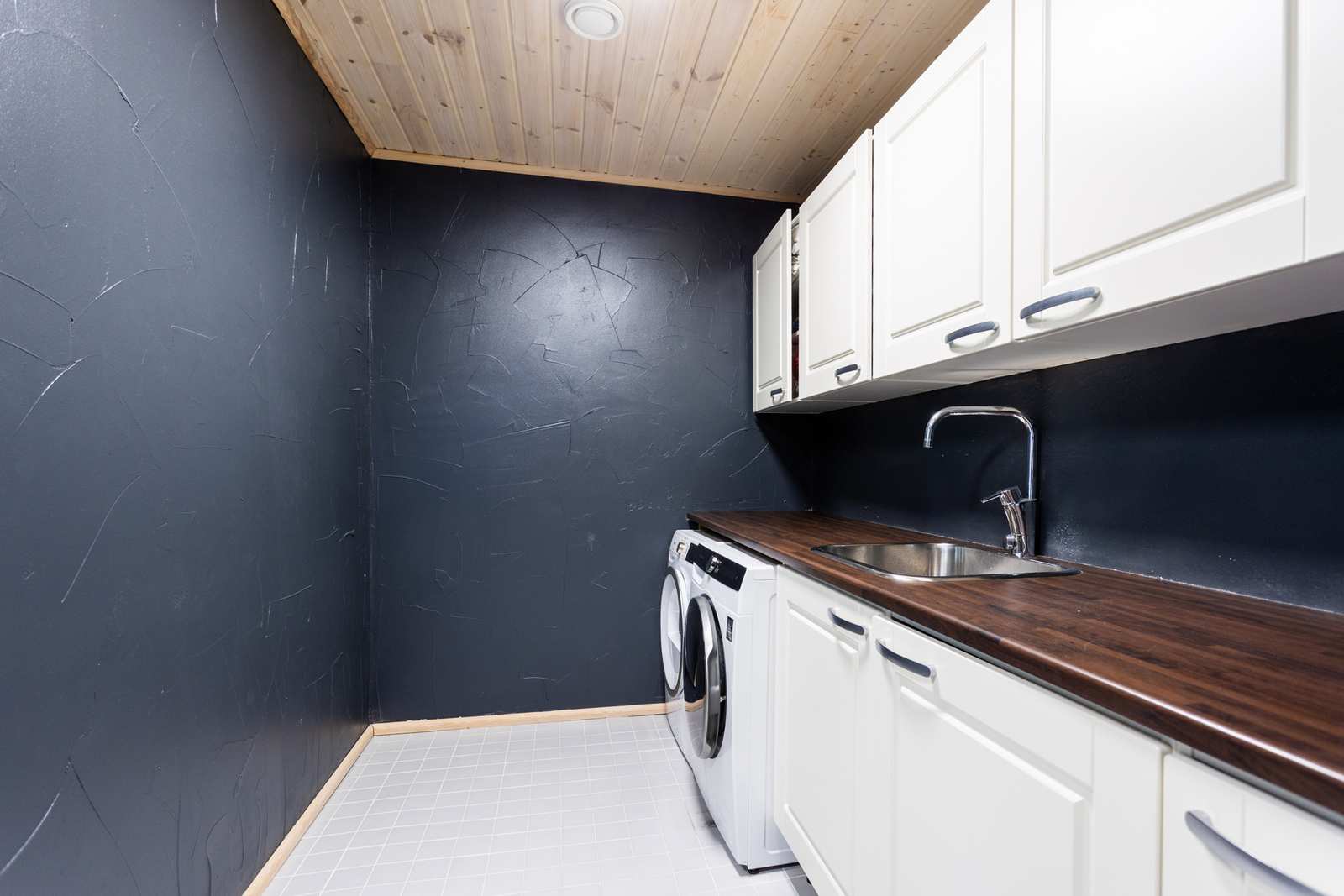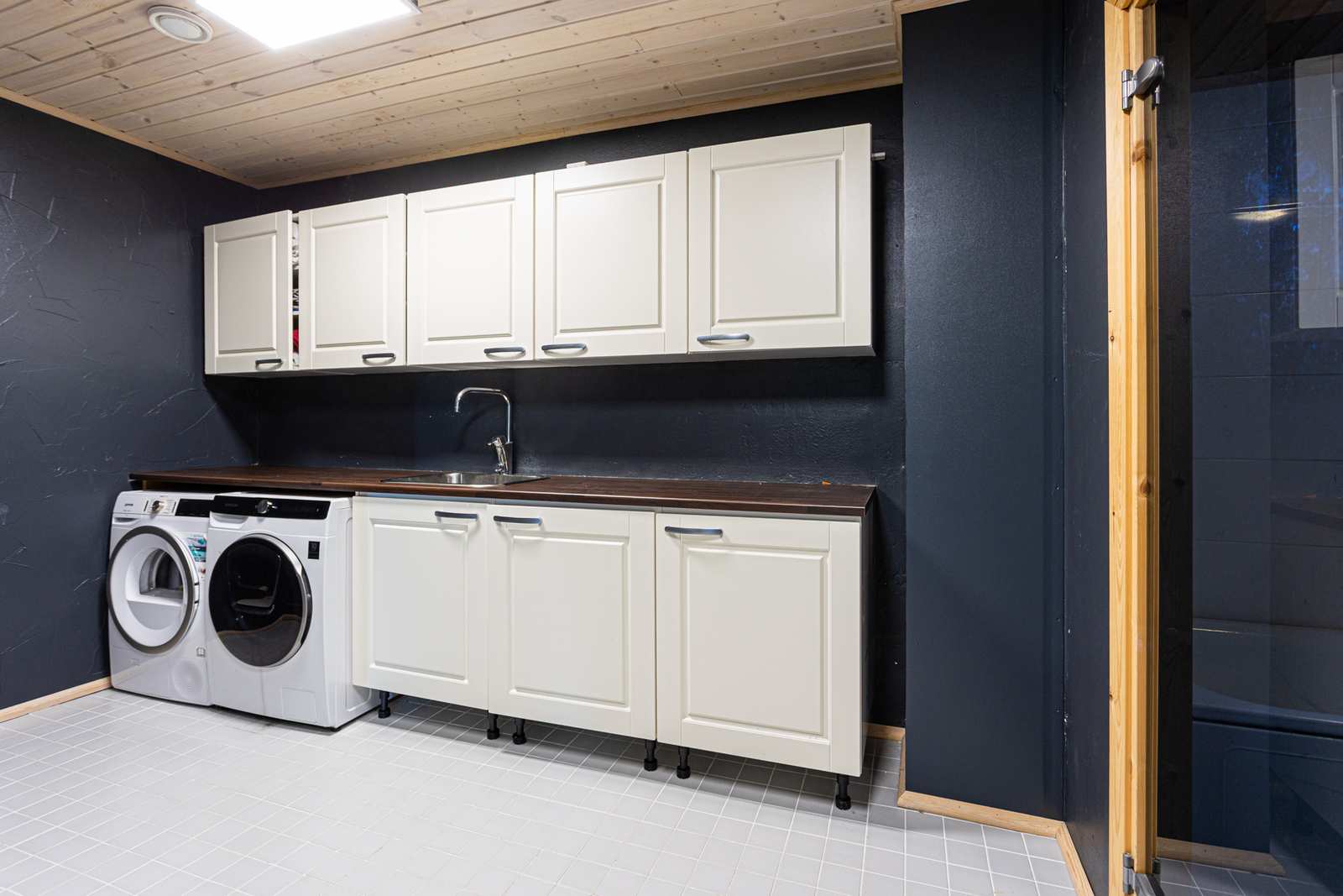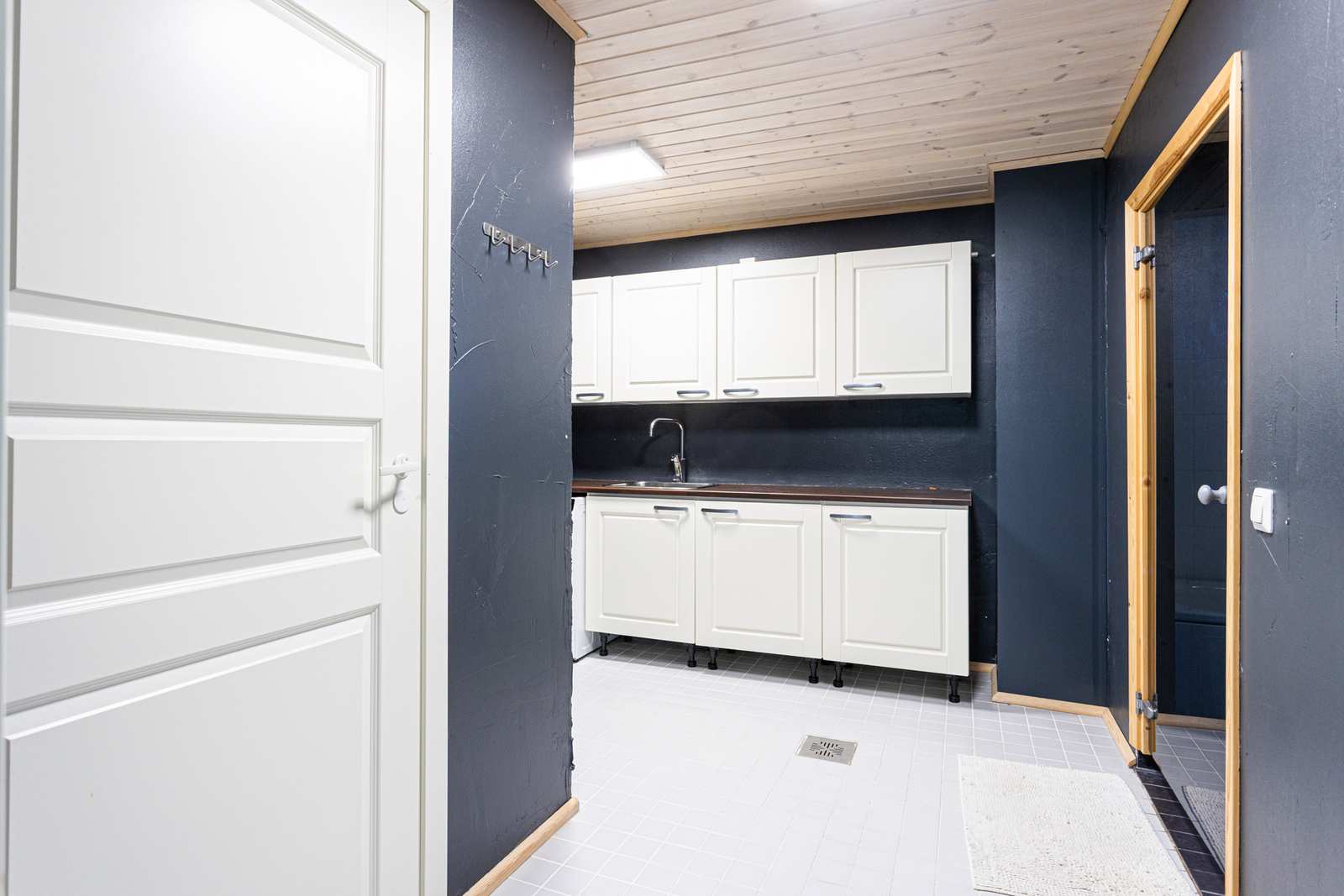 Kodinhoitohuone | Kodinhoitotilat alakerrassa. Runsaasti kaappi- ja tasotilaa. Pyykinpesukoneen liitäntä. |
