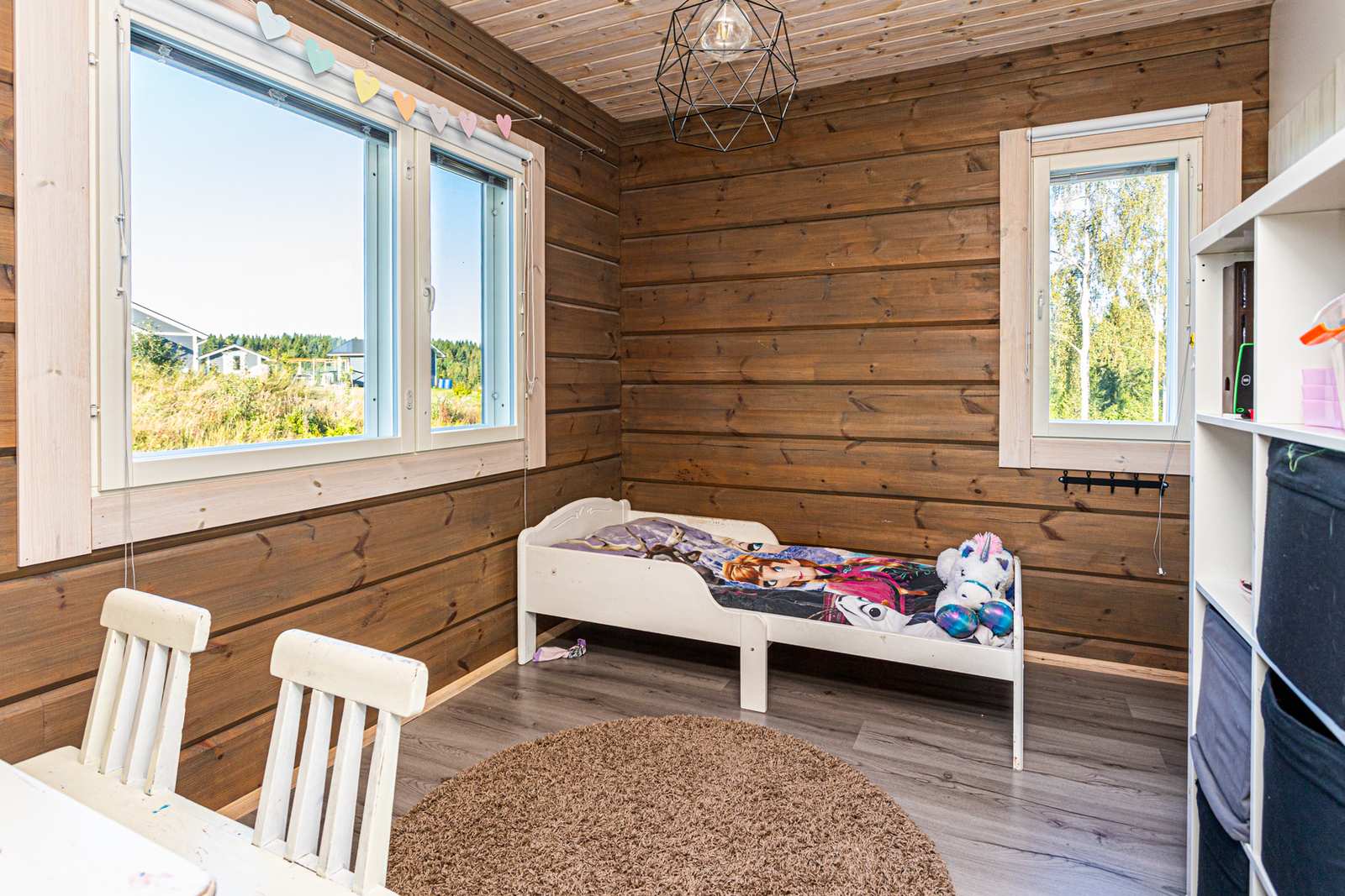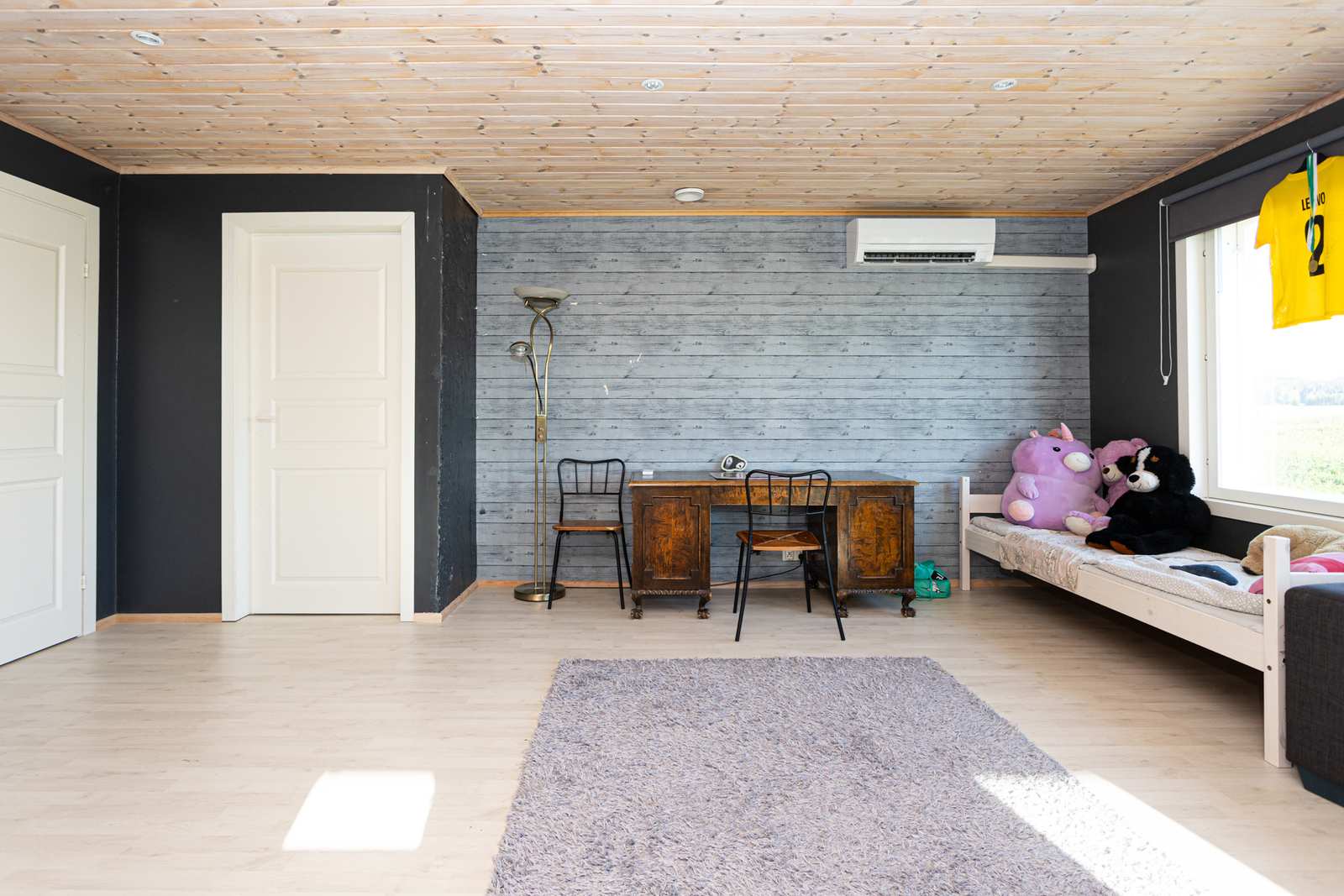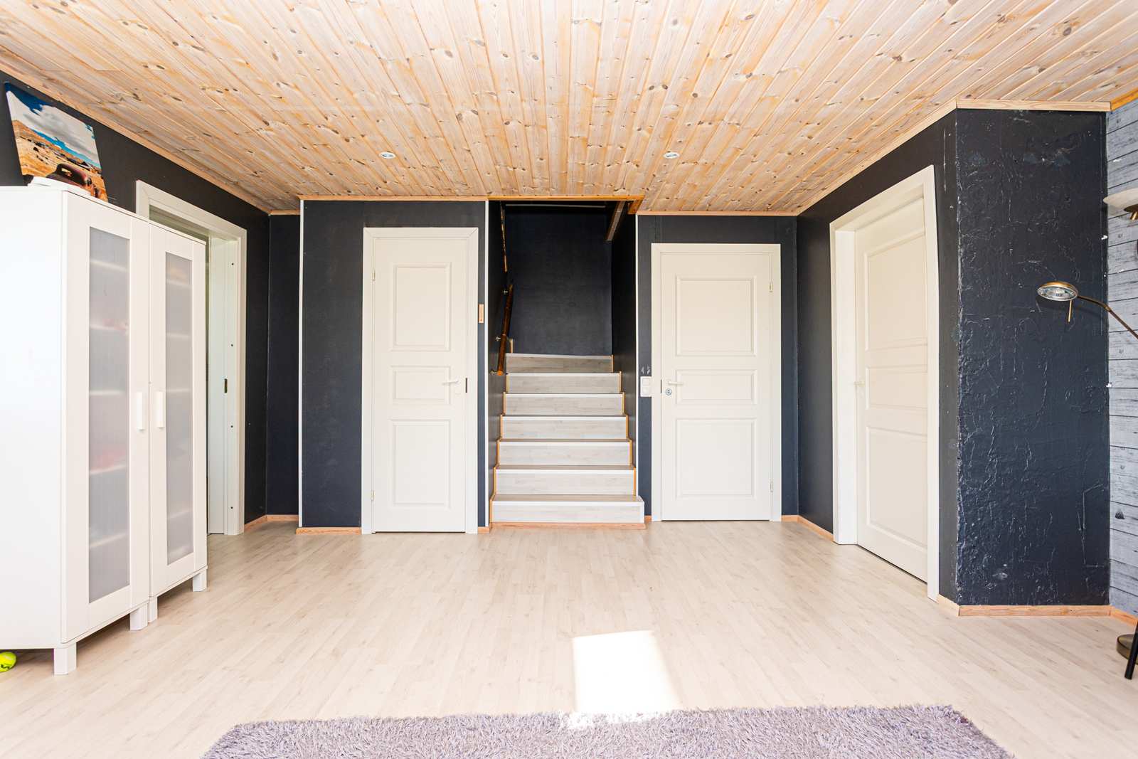 Alakerrassa ovat sauna-, pesu- ja kodinhoitotilat, makuuhuone sekä erittäin tilava oleskeluhuone, joka sopii mainiosti myös työtilaksi sekä makuuhuoneeksi.