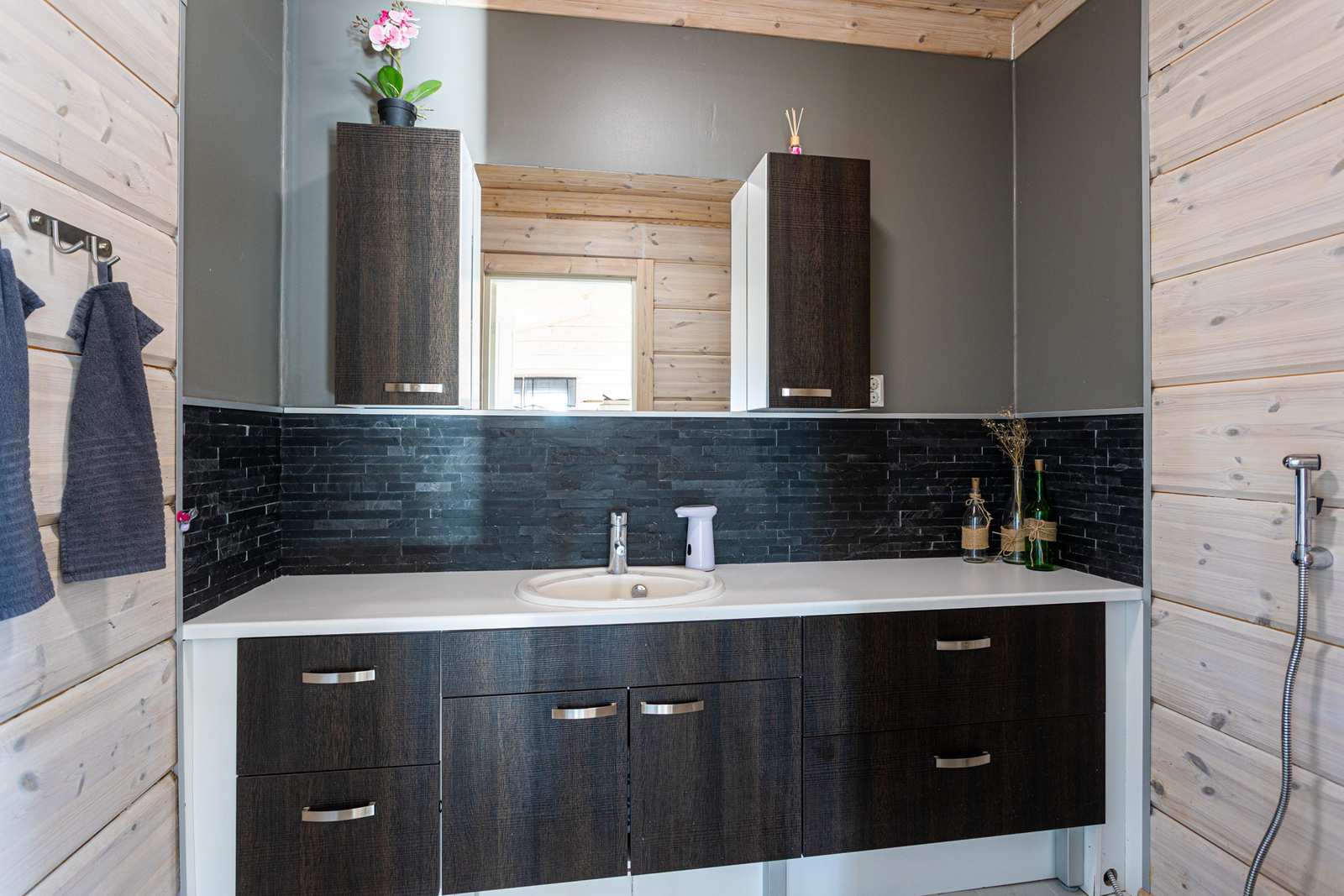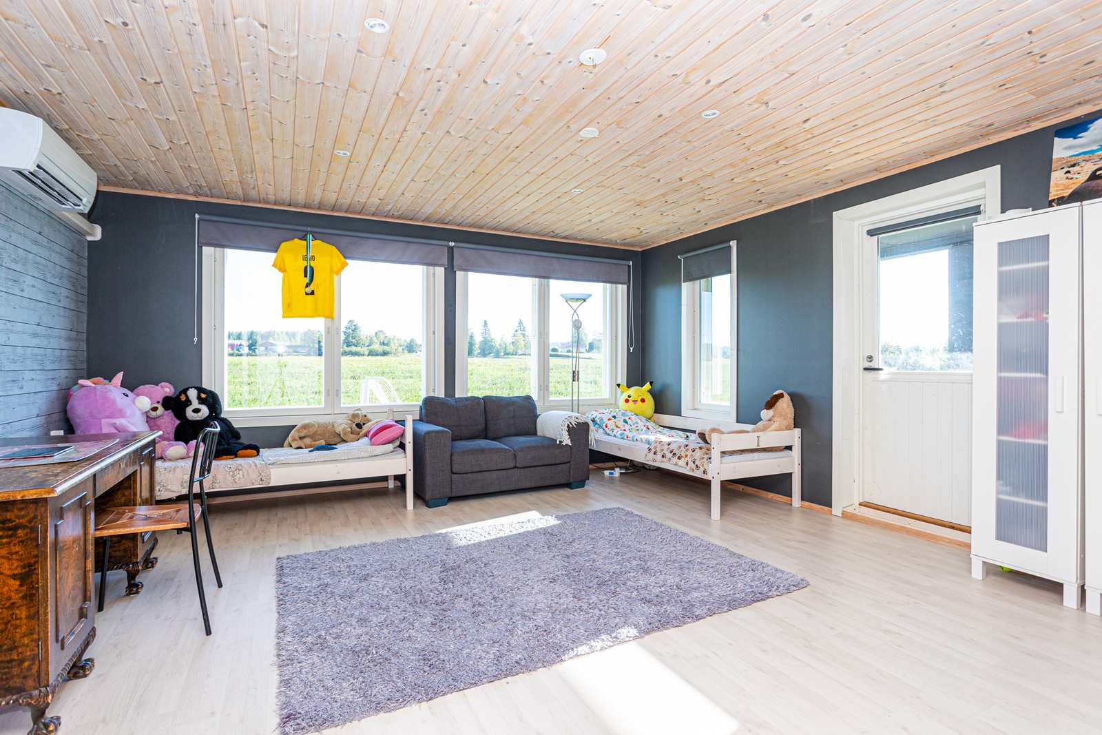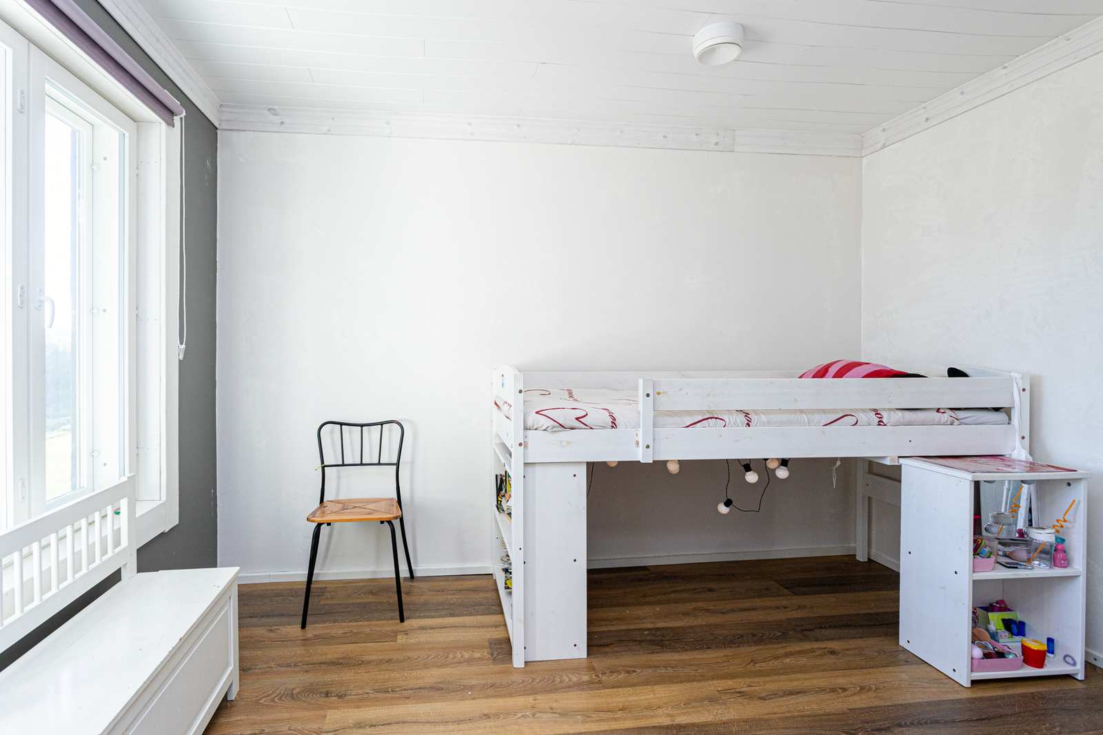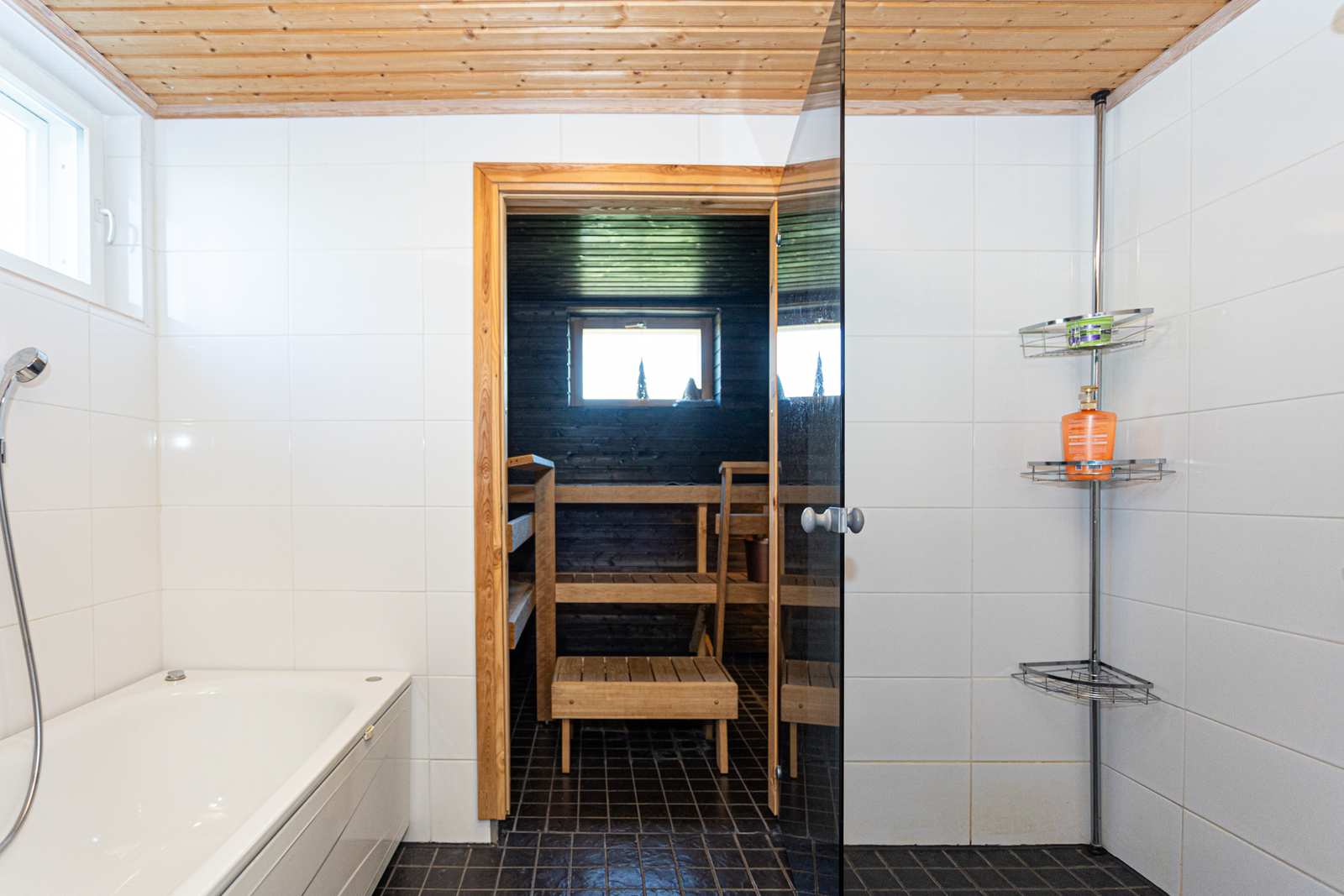 Alakerrassa ovat sauna-, pesu- ja kodinhoitotilat, makuuhuone sekä erittäin tilava oleskeluhuone, joka sopii mainiosti myös työtilaksi sekä makuuhuoneeksi.