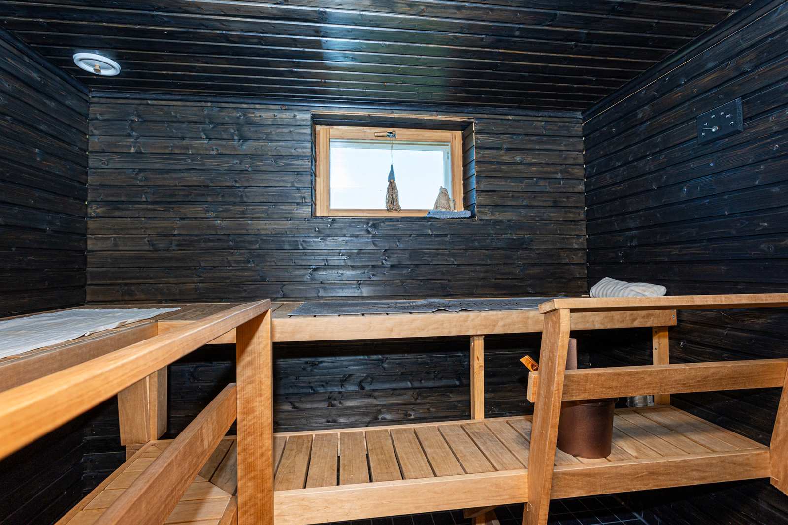 Saunan kuvaus | Saunassa sähkökiuas. Lattiassa laatoitus, seinissä ja katossa tumma paneeli. Ikkuna. |