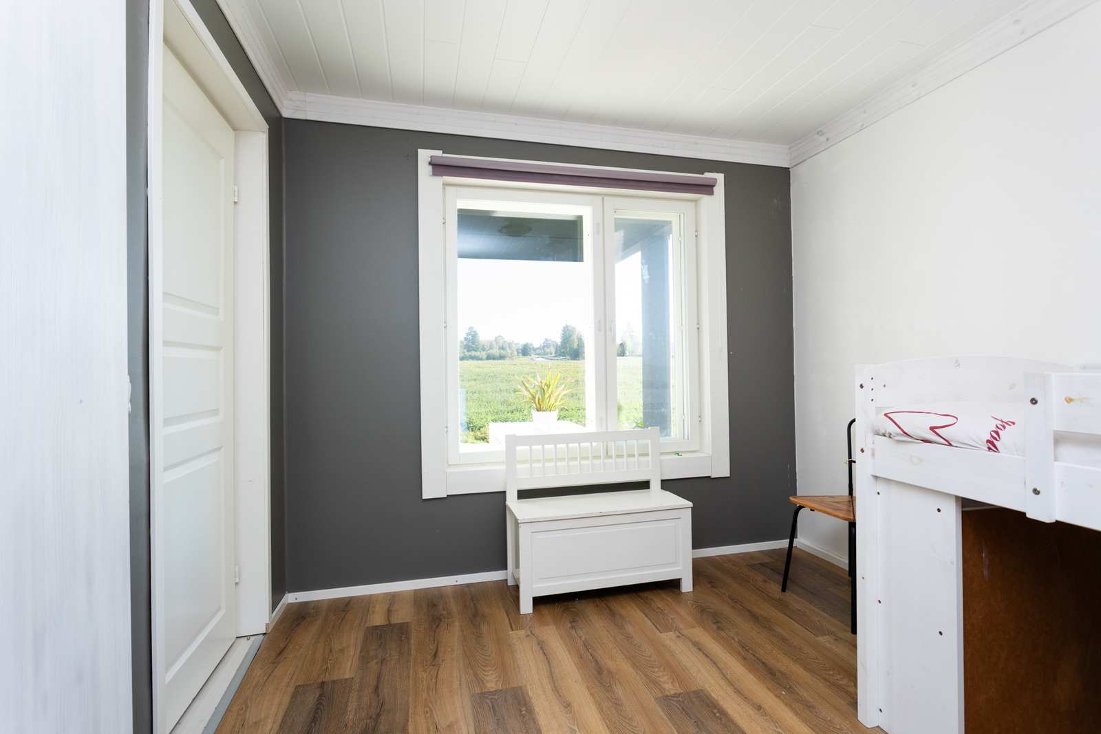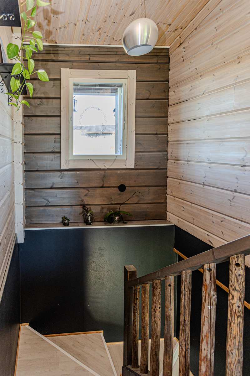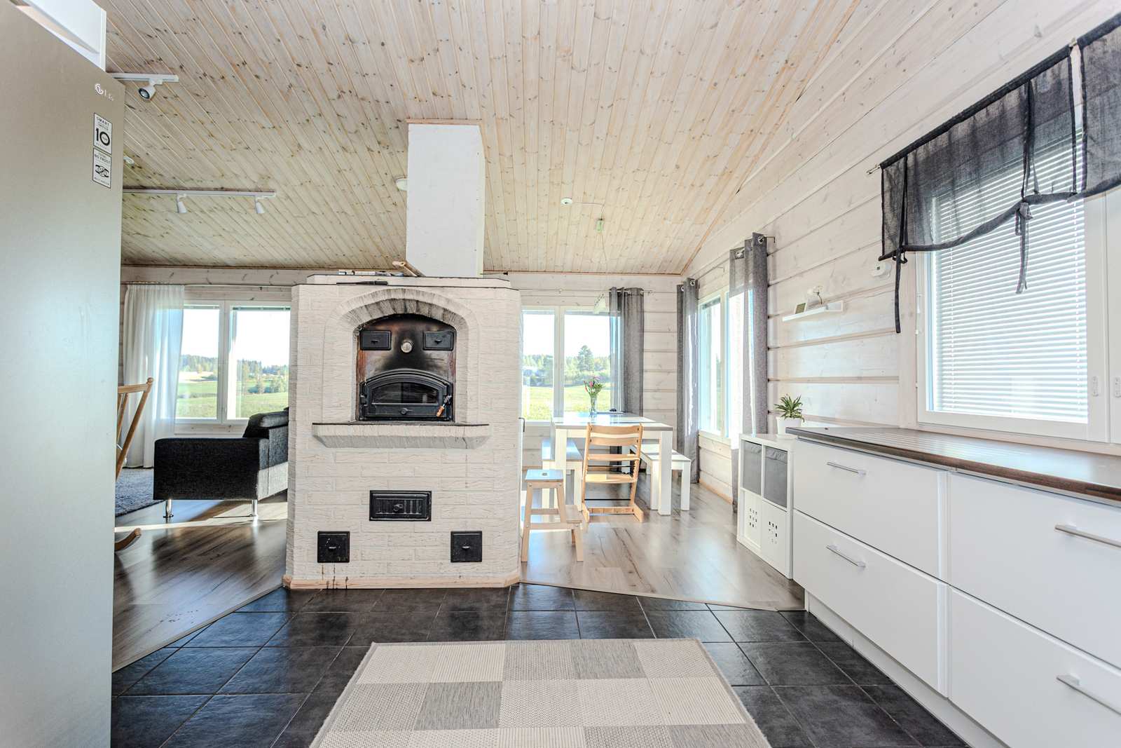 Sisääntulokerroksessa on kahden makuuhuoneen ohella tilava olohuone, josta avoin yhteys keittiöön ja ruokailutilaan. Tilanjakajana toimii tiilimuurattu leivinuuni ja avaruutta sekä valoisuutta tuo vinokatto.