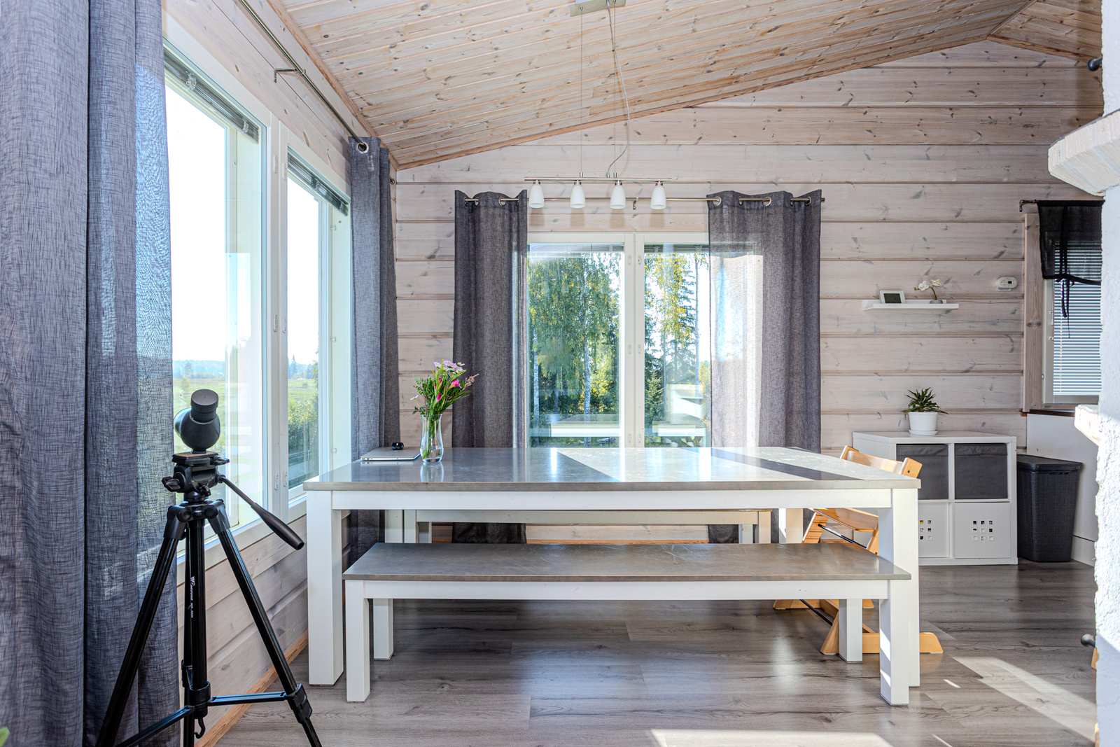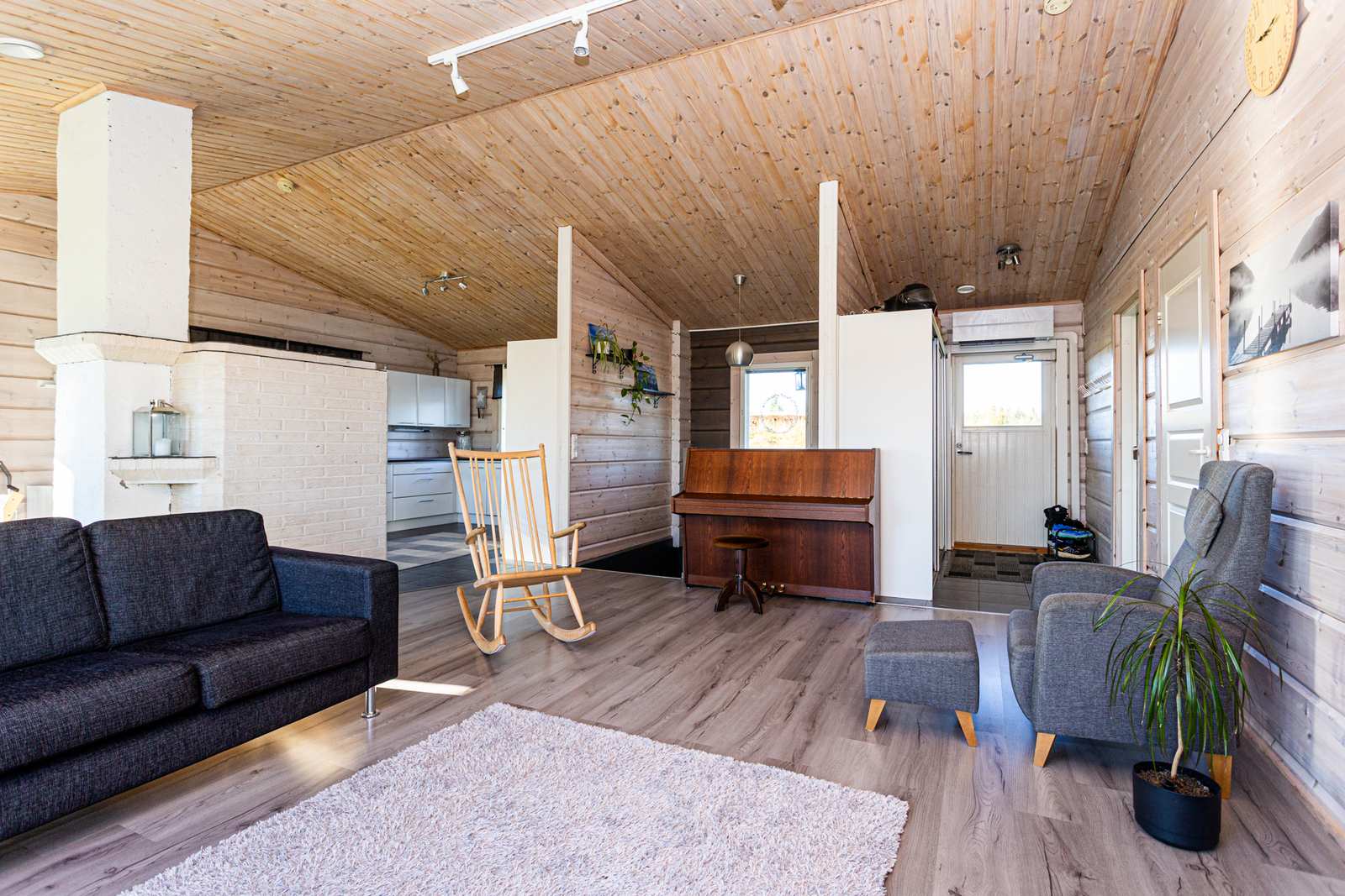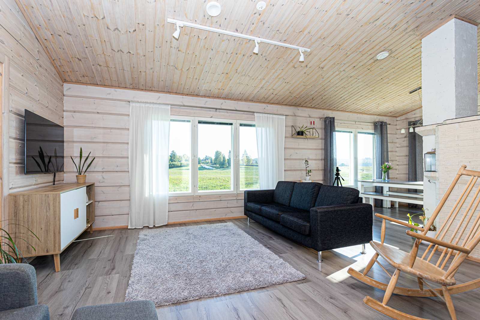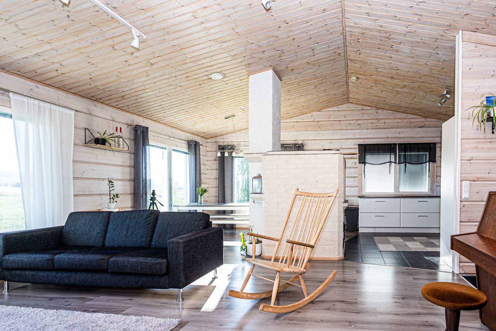 Olohuone | Lattiassa laminaatti, seinissä hirsi, katossa paneeli. |