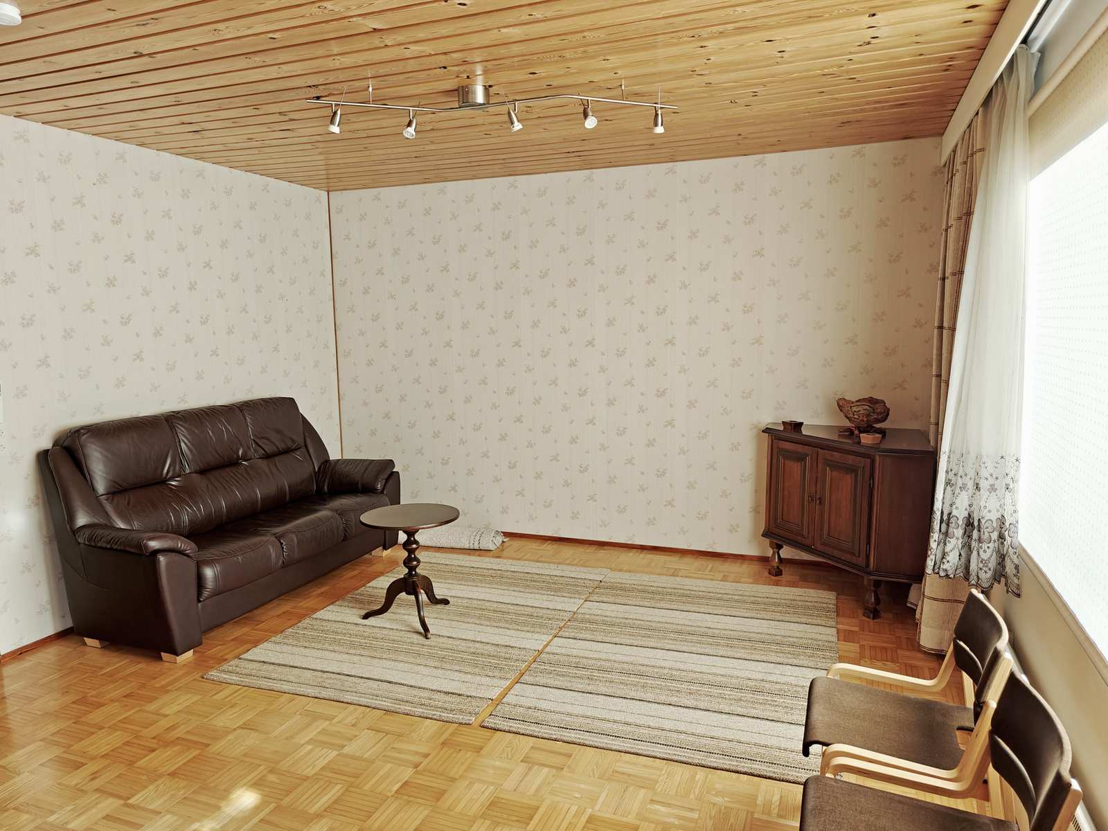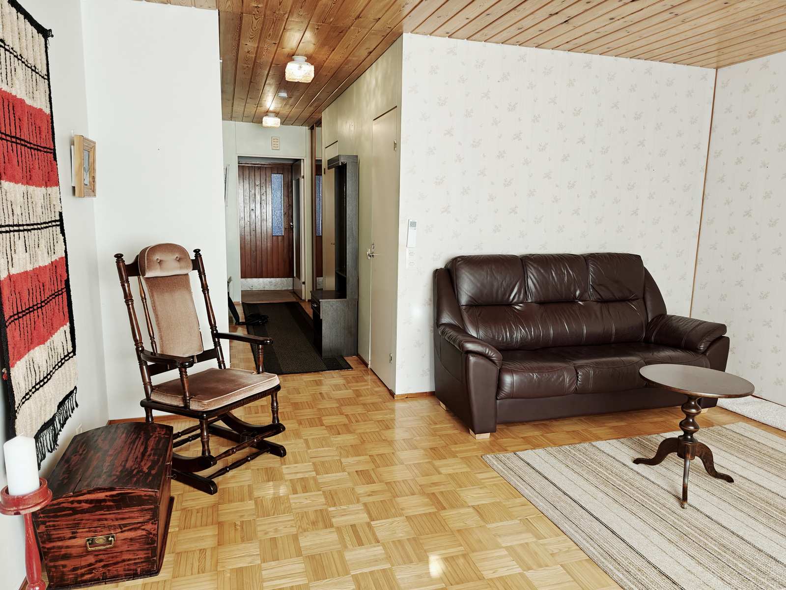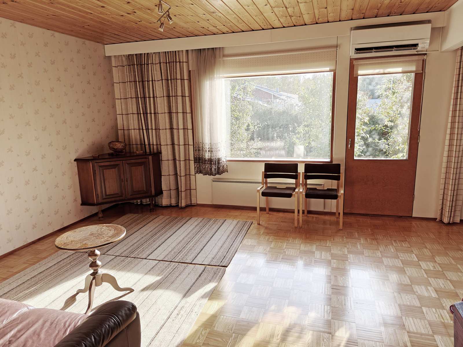 Olohuone | Lattiassa parketti, seinissä tapetti ja maali, katossa paneeli. Käynti takapihalle. |