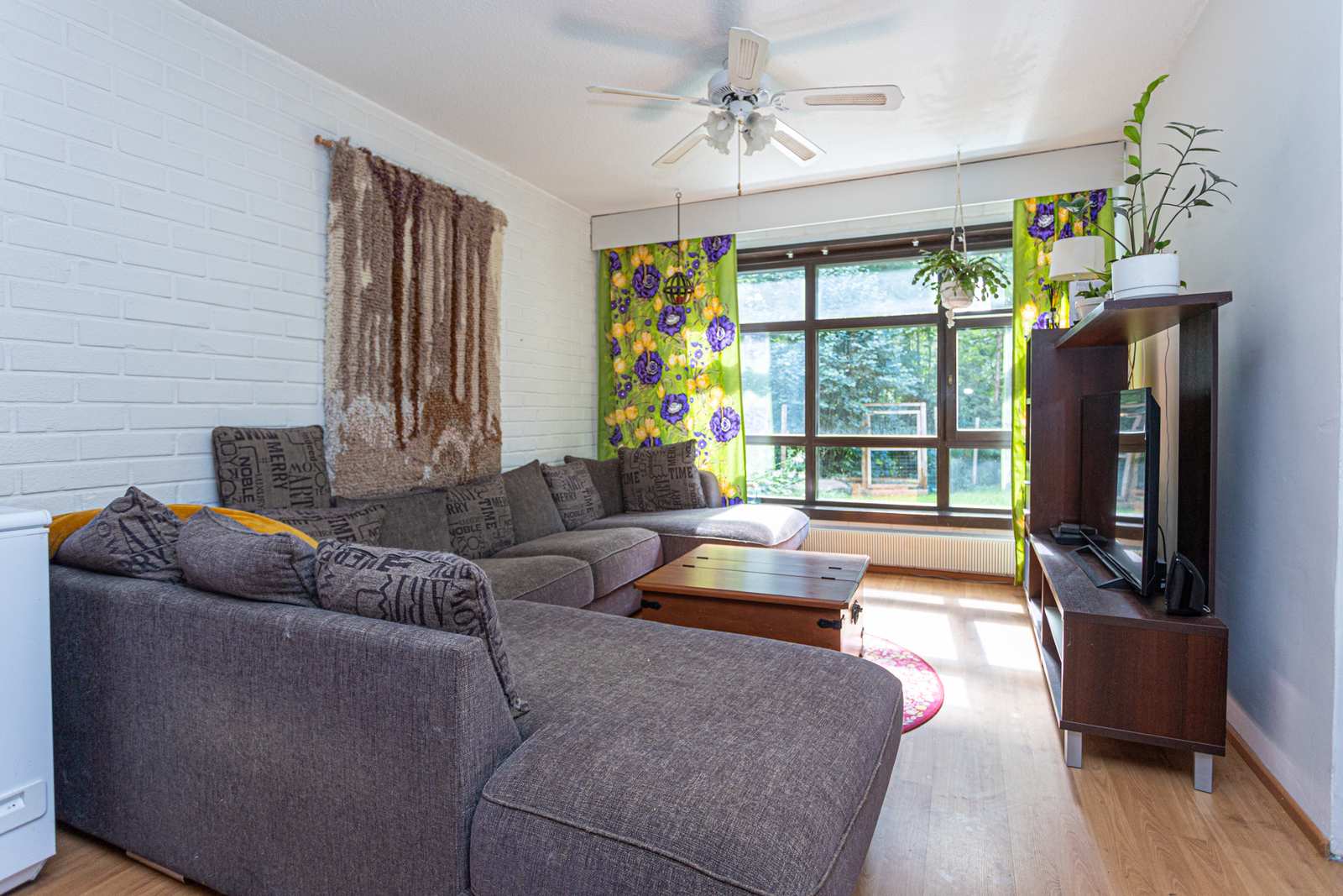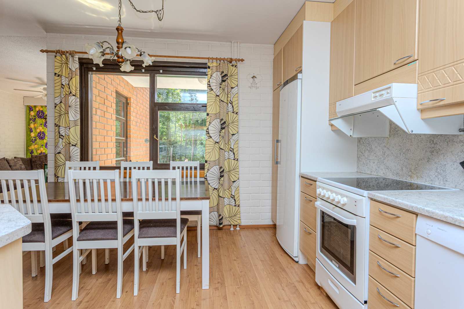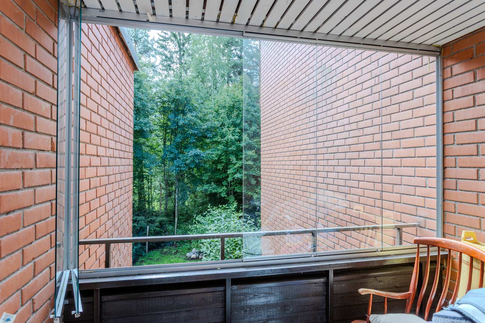 Olohuoneesta ja keittiöstä sekä parvekkeelta on näkymät metsikköön, johon takapiha rajoittuu.
