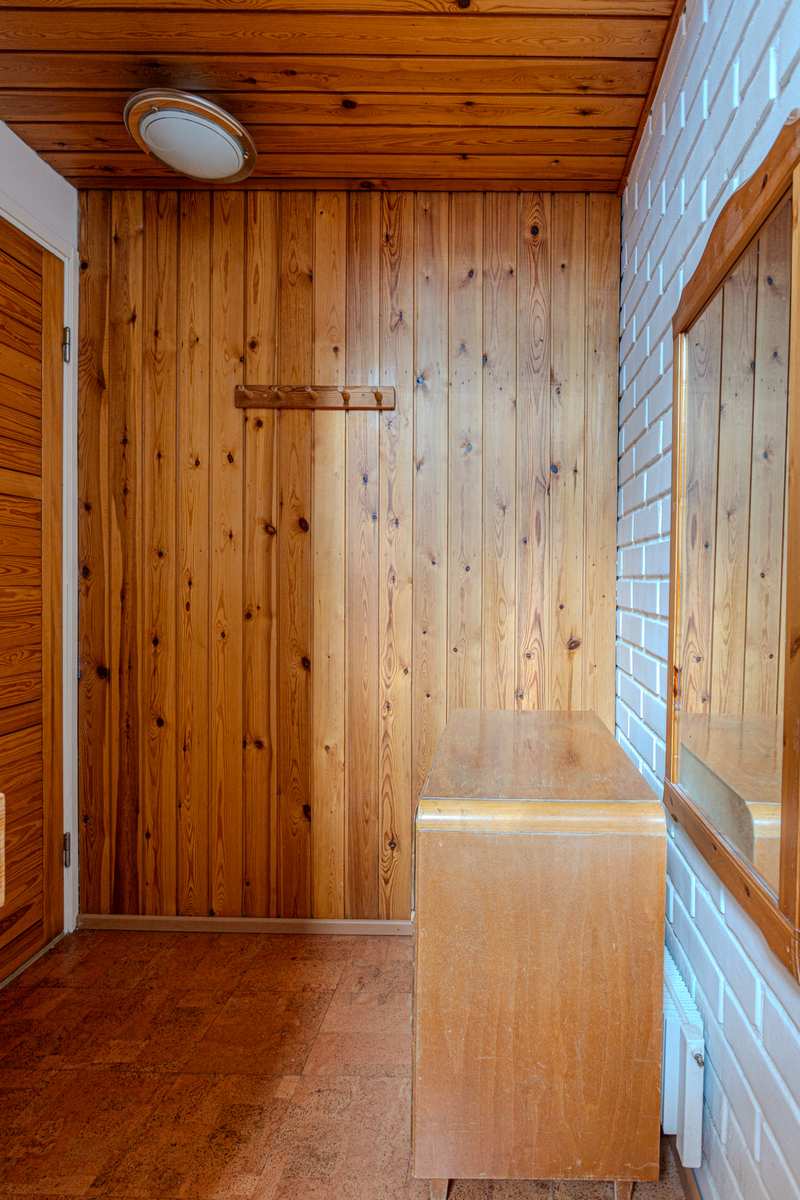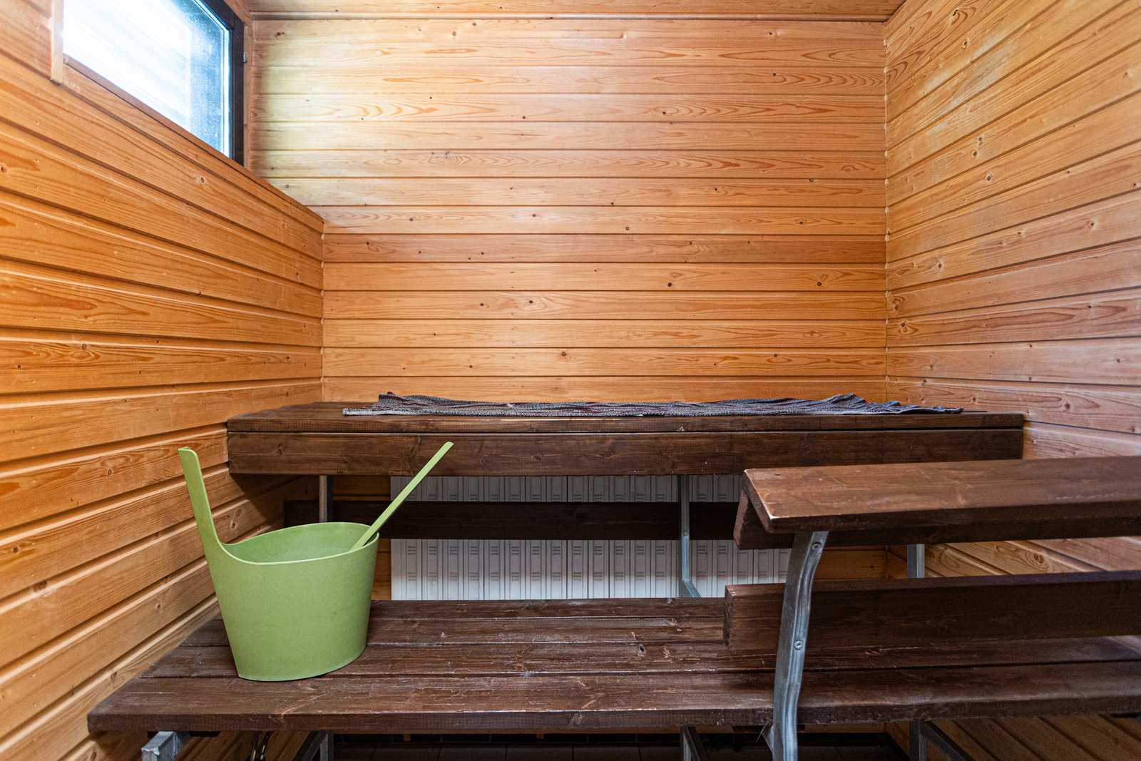 Saunan kuvaus | Sähkökiuas. Lattiassa laatoitus, seinissä ja katossa paneeli. Patteri, ikkuna. |