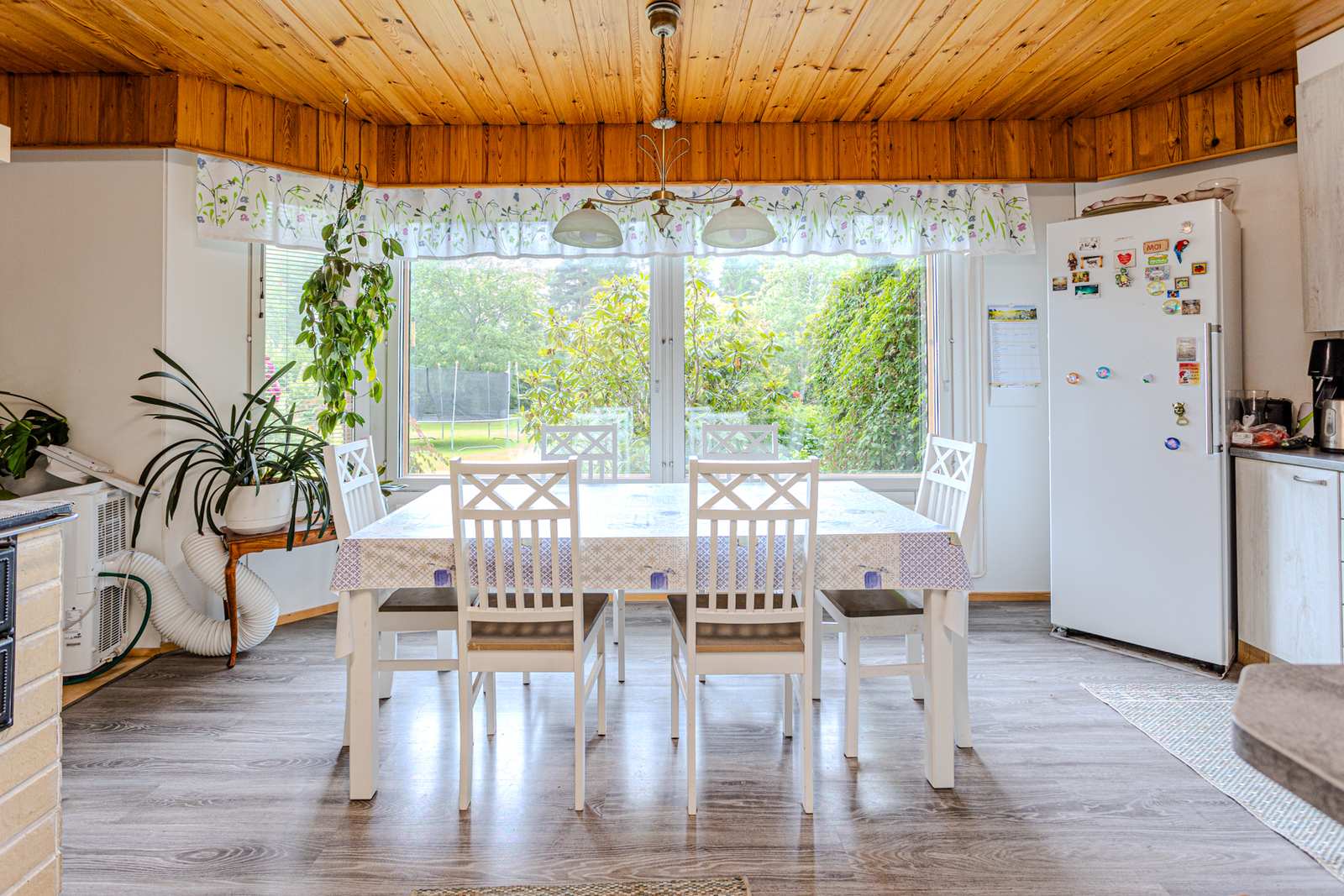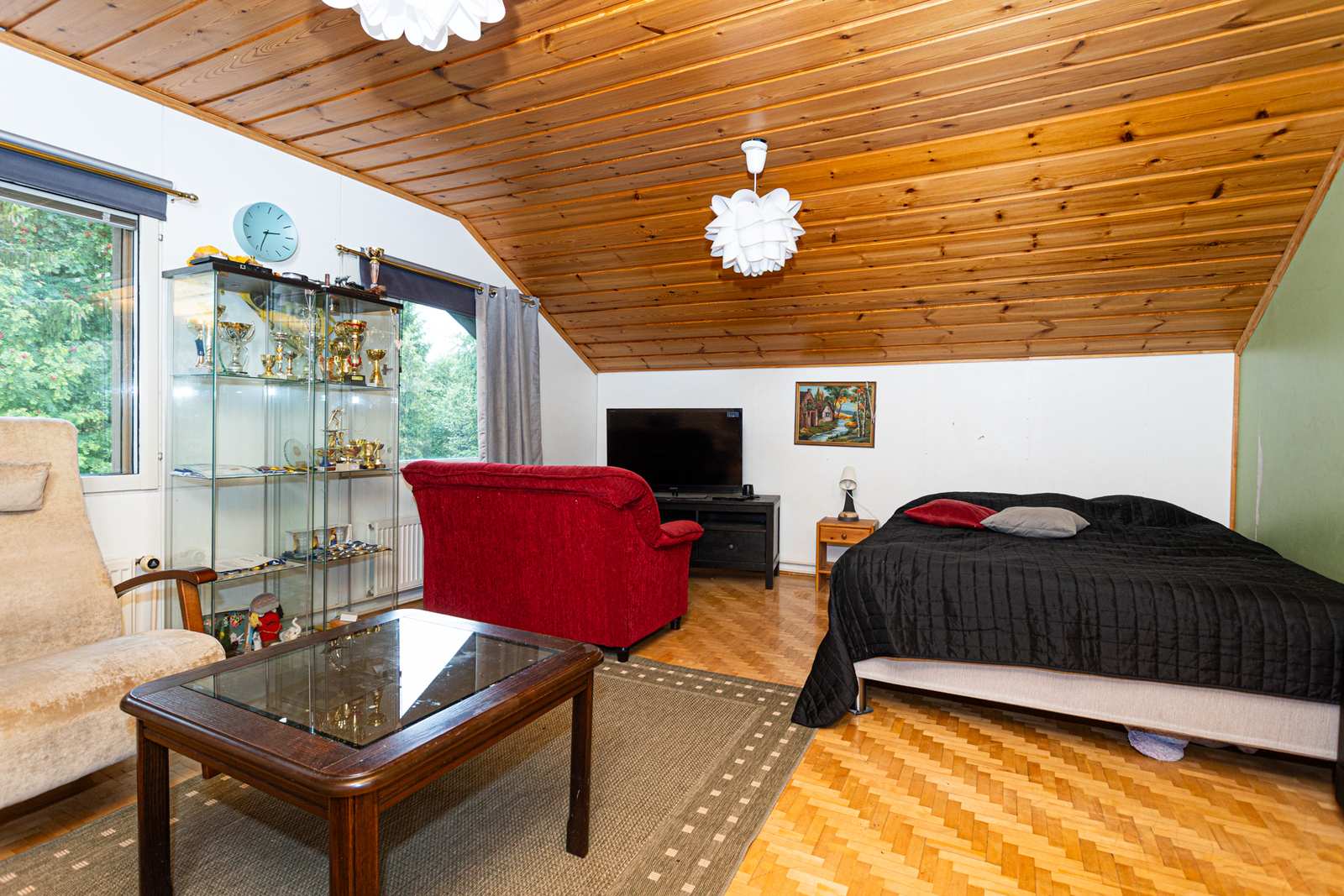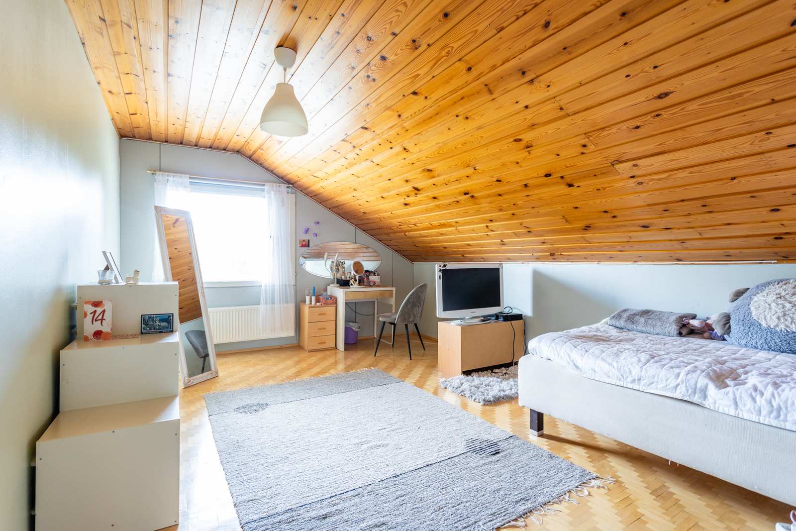 Tässä v. 1989 valmistuneessa valkoisessa lohkotiiliverhoillussa talossa on tiloja isommankin perheen tarpeisiin. Asuinneliöitä on piirustusten mukaan 255 m². Alakerrassa keittiön, olohuoneen ja makuuhuoneen ohella ovat kodinhoitotilat, sauna- ja pesutilat sekä lämmin autotalli. Yläkerrassa on kolme hyvin tilavaa makuuhuonetta, oma wc, tilava aula sekä parveke. Lisäksi tilava kellari.
