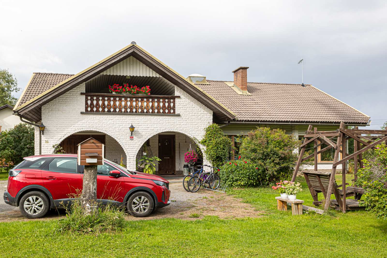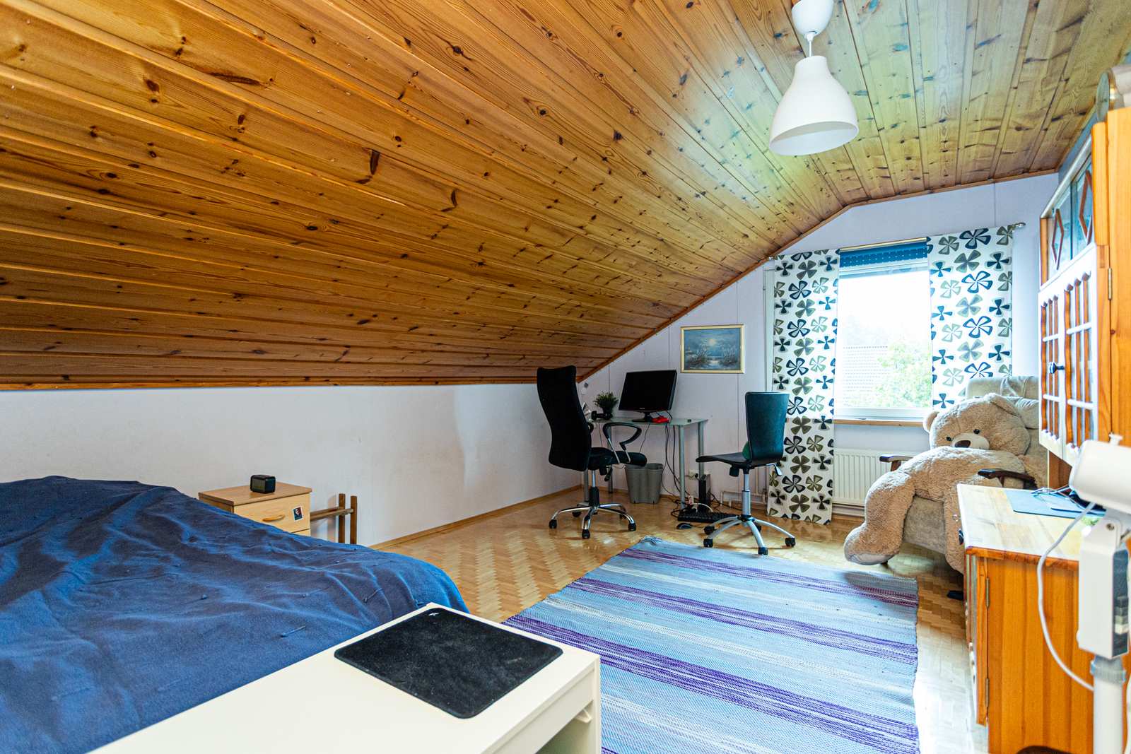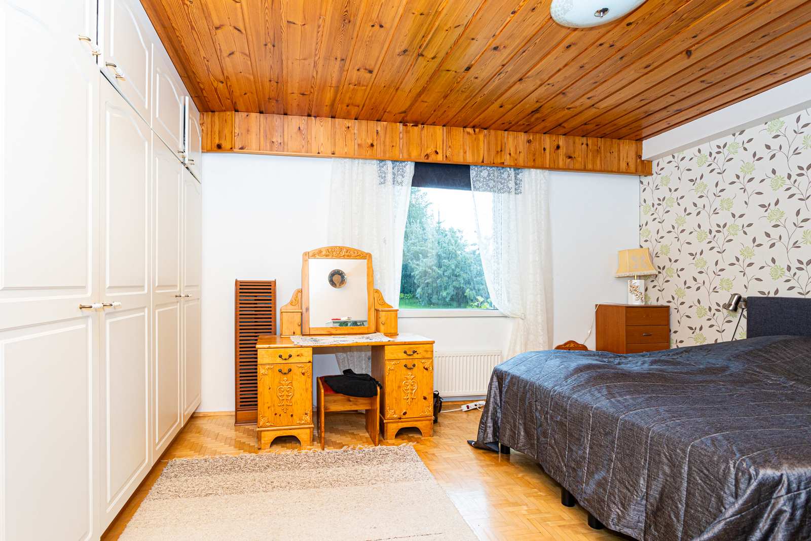 Tässä v. 1989 valmistuneessa valkoisessa lohkotiiliverhoillussa talossa on tiloja isommankin perheen tarpeisiin. Asuinneliöitä on piirustusten mukaan 255 m². Alakerrassa keittiön, olohuoneen ja makuuhuoneen ohella ovat kodinhoitotilat, sauna- ja pesutilat sekä lämmin autotalli. Yläkerrassa on kolme hyvin tilavaa makuuhuonetta, oma wc, tilava aula sekä parveke. Lisäksi tilava kellari.
