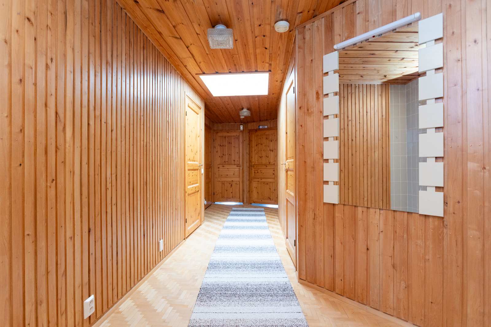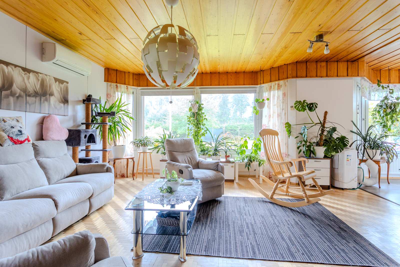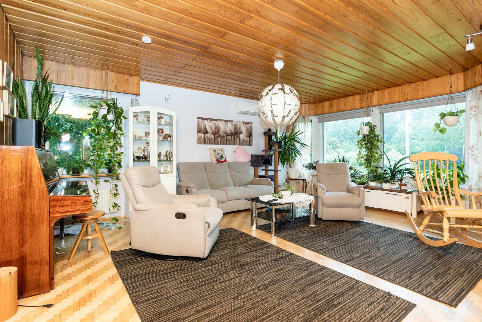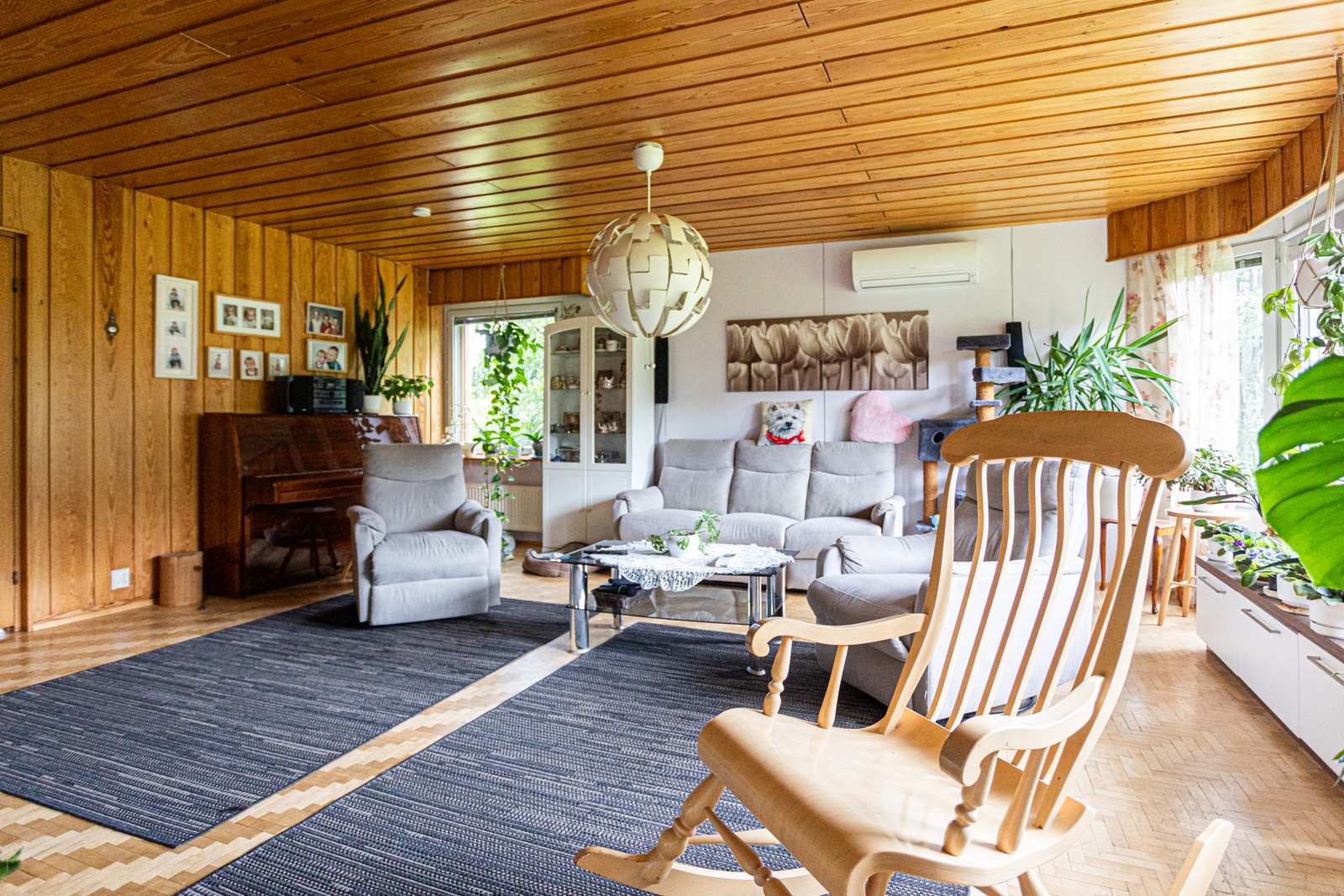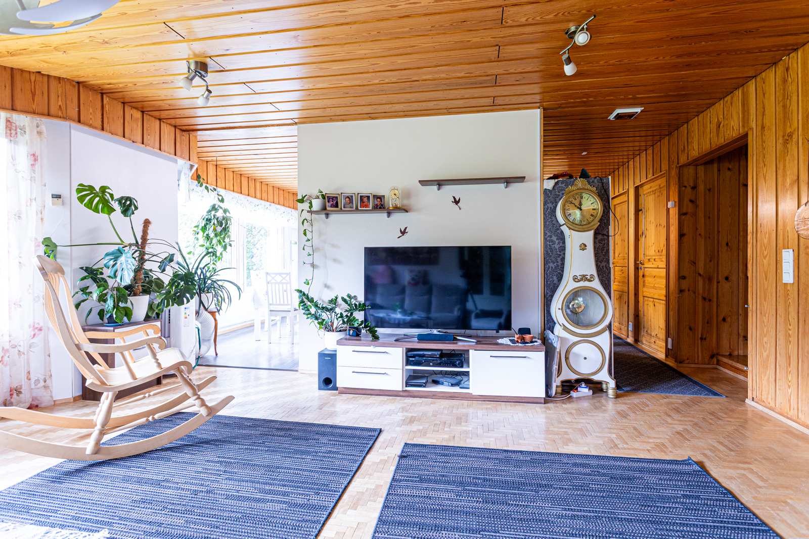 Olohuone | Tilava olohuone. Lattiassa koivuparketti, seinissä puu- ja maalipintoja, katossa paneeli. |