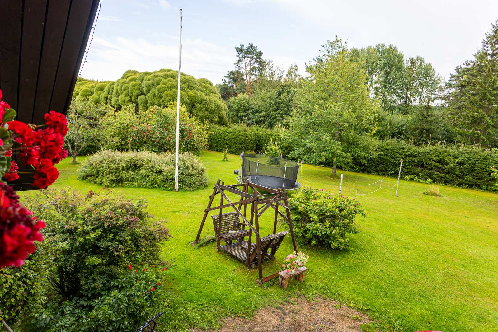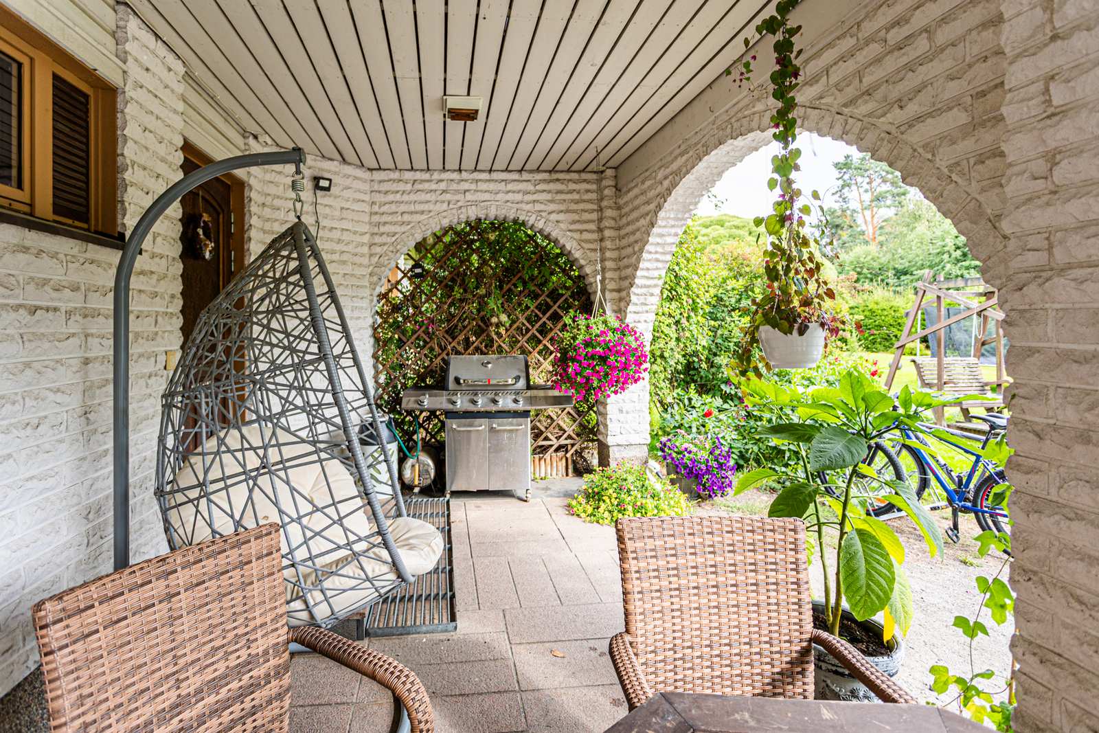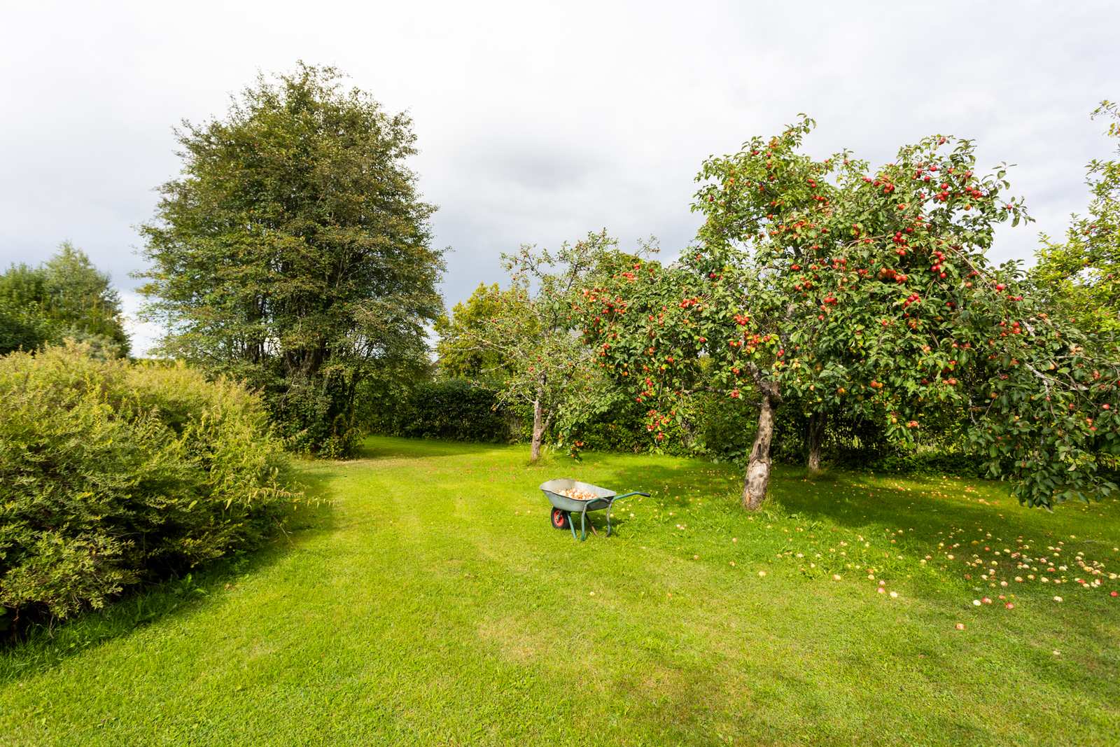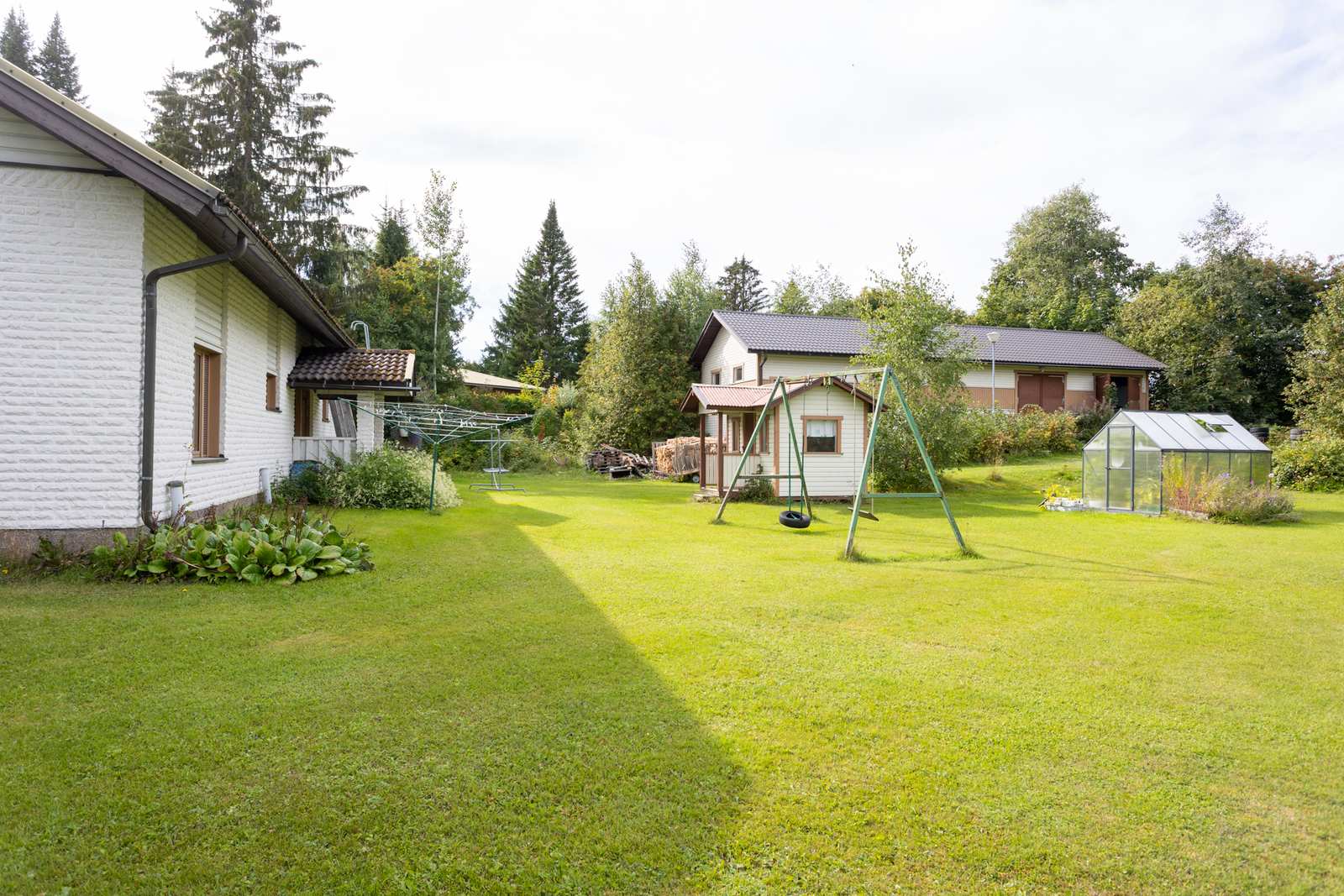 Talo sijaitsee omalla 3 980 m²:n vehreällä tontilla, jonka suojaisella ja laajalla nurmikentällä mahtuu hyvin touhuamaan ja pelailemaan. Satoisia omenapuita tontilla on myös sekä muita istutuksia.