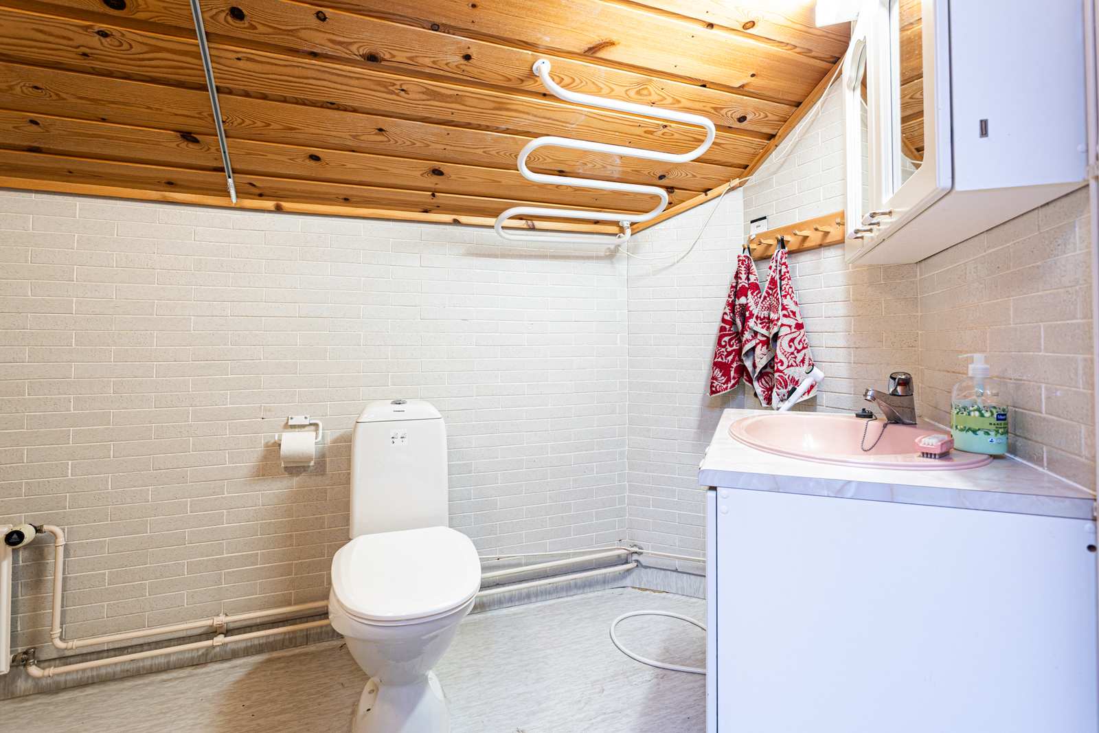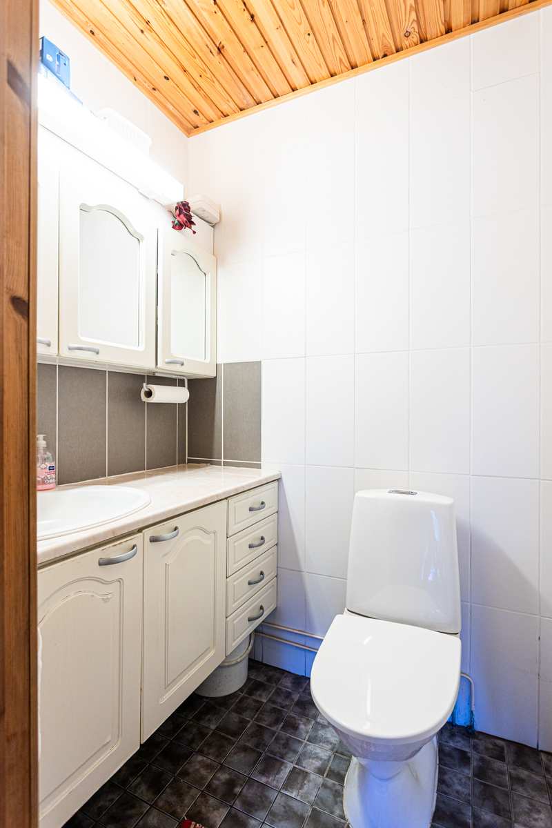 Erillinen WC | 2 kpl (1 alakerrassa ja toinen yläkerrassa, jonka yhteydessä suihkutila). Molemmissa vessoissa useita kaappeja. Alakerran wc:een lattiassa ja seinissä laatta, katossa paneeli. Yläkerran wc:een lattiassa muovimatto, vinokatto paneelia. |