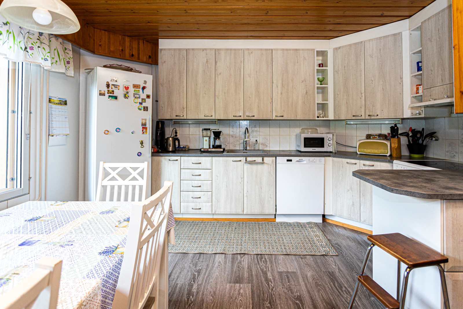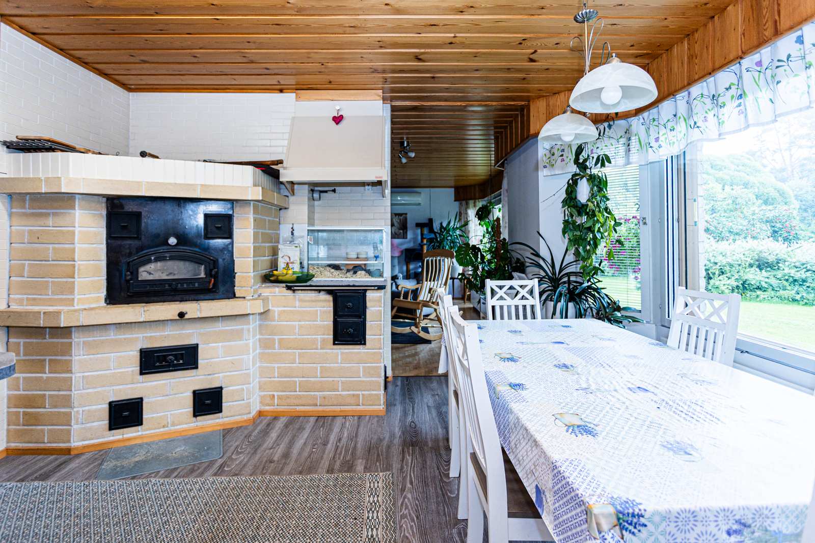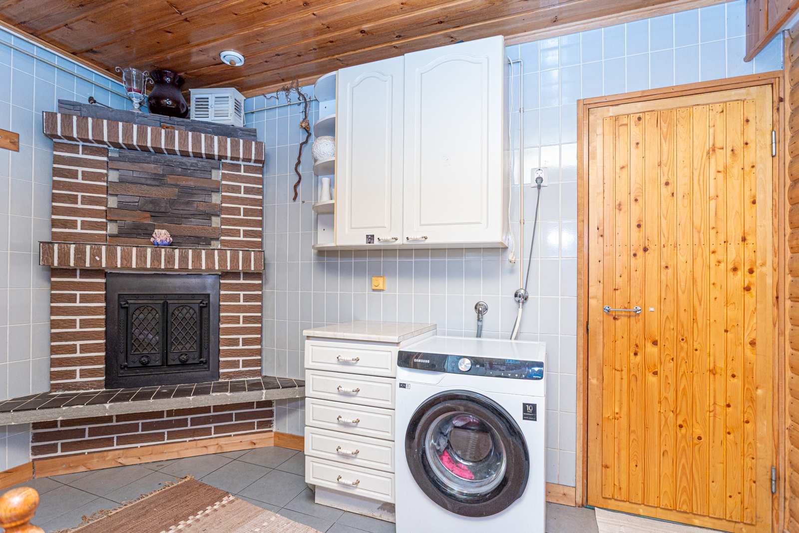 Kodinhoitohuone | Yhdistetty takkahuone/kodinhoitotila. Suoravetoinen takka. Runsaasti kaappeja ja tasotilaa. Pyykinpesukoneen liitäntä. Lattiassa laatta, seinissä laatta ja maali, katossa paneeli. Sähköinen lattialämmitys. |
