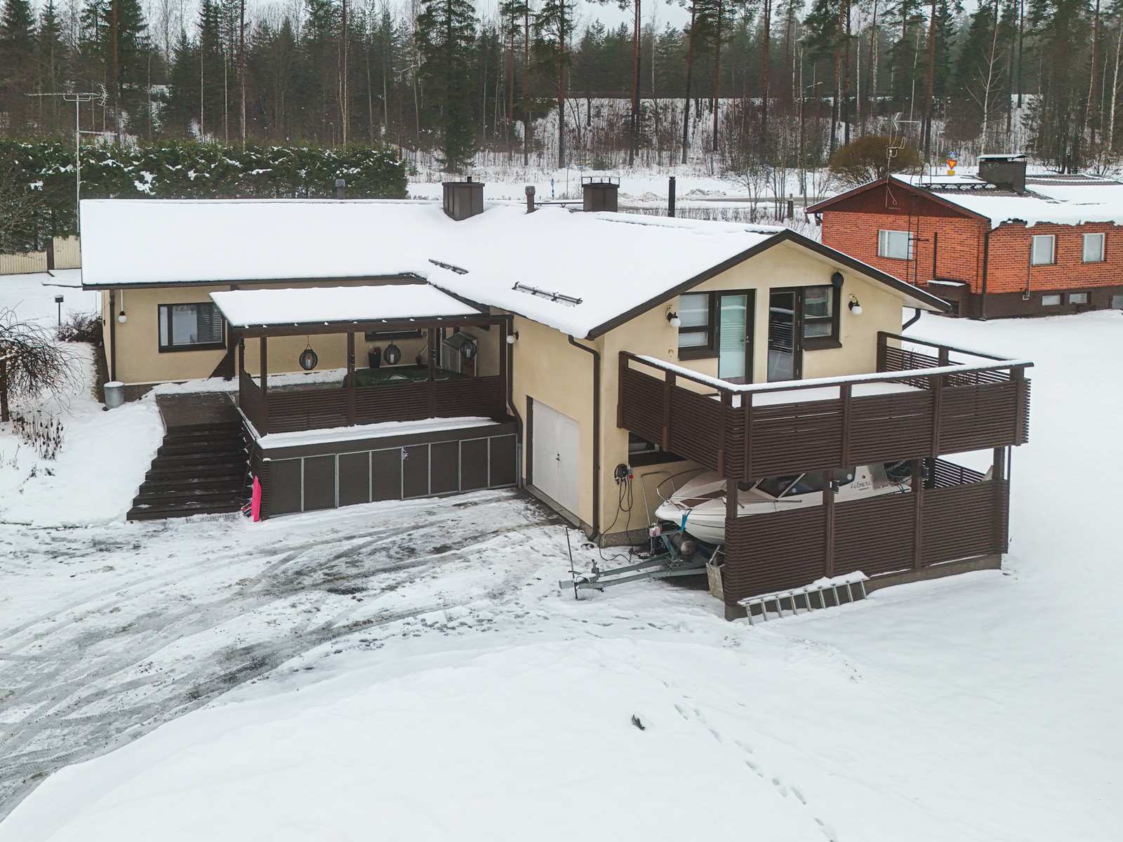 | Tehdyt korjaukset ja remontit | 2025 Keittiö remontoitu loppuvuonna 2025 Maalattu kh-tilan seiniä 2025 Kellaritilan muutos/remontti 2024 Induktiotaso joulukuussa 2023 Lämmitysmuodon muutos: vesi-ilmalämpöpumppu ja ilmalämpöpumppu 2021 Sauna ja kylpyhuone remontoitu 2020 Keittiön liesikupu uusittu 2019 Terassi rakennettu 2008 Lasikuisti/terassi rakennettu 2007 Talon laajennus/peruskorjaus, jonka yhteydessä uusittu vesikatto, ikkunat, ovet, ilmanvaihto, viemäröinti, käyttövesiputkisto 1998 Asennettu ulkopuolella sokkeliin perusmuurilevy sekä sadevesijärjestelmä |