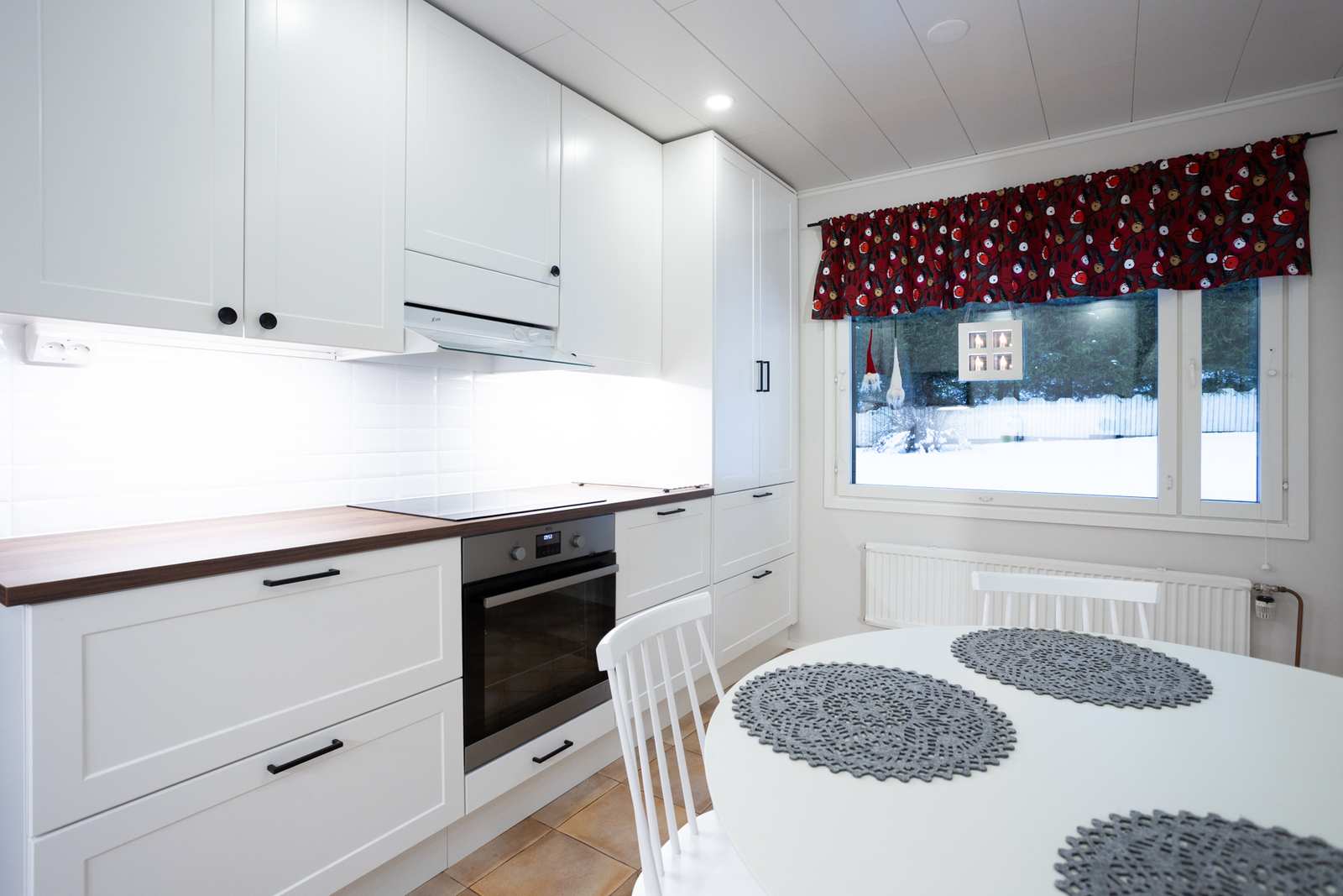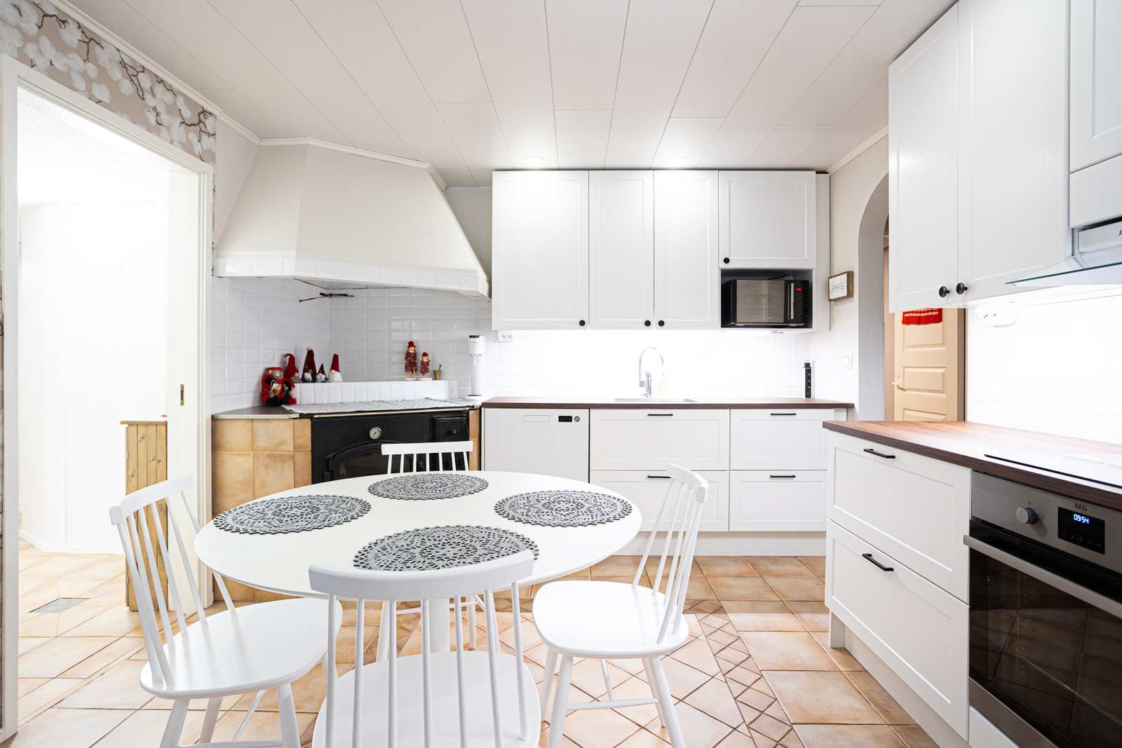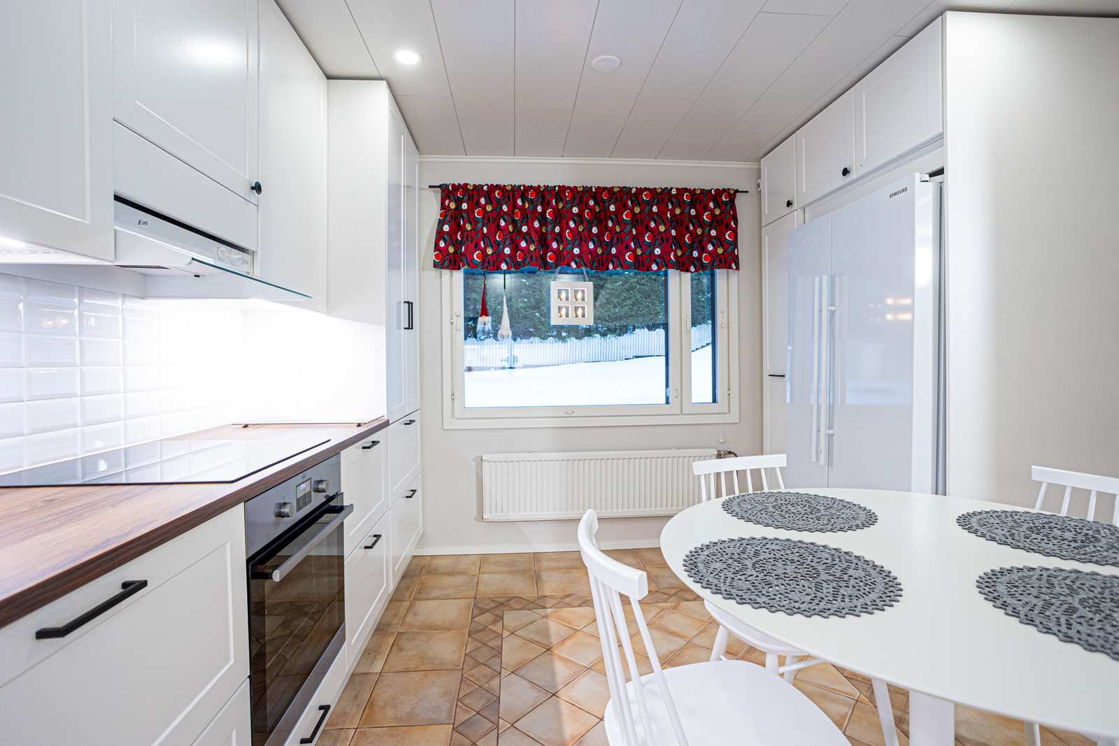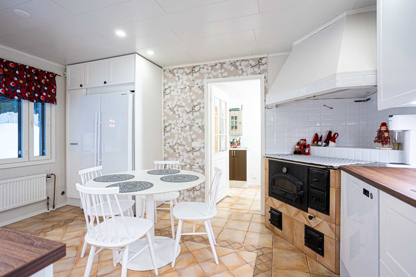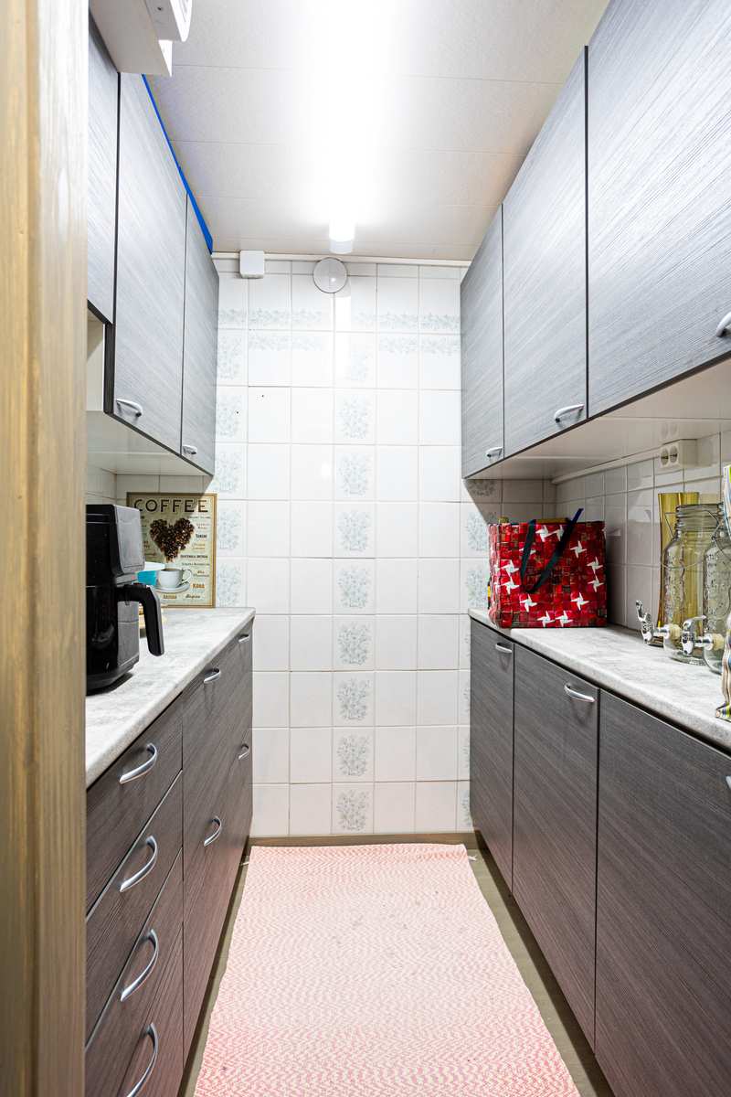 | Keittiön varustus | Seinät: tapetti Lattia: laatta |