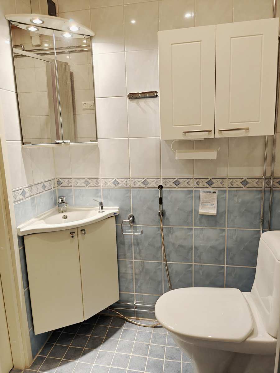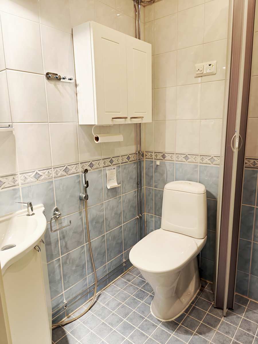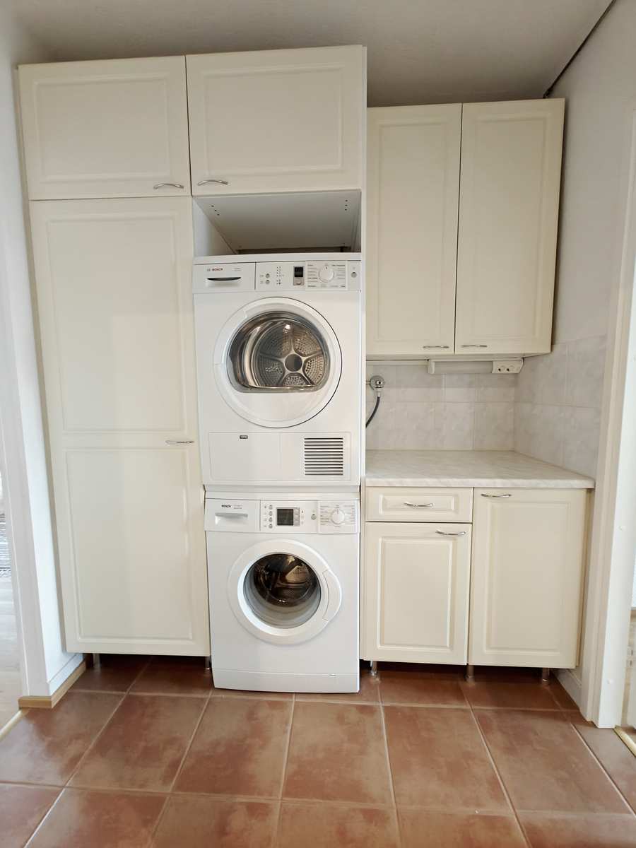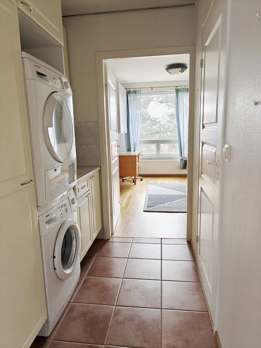 Asunnon kylpyhuone on saatu tilavaksi sijoittamalla pyykinpesukone, kuivausrumpu sekä pyykkikaapit kylpyhuoneen ulkopuolelle.