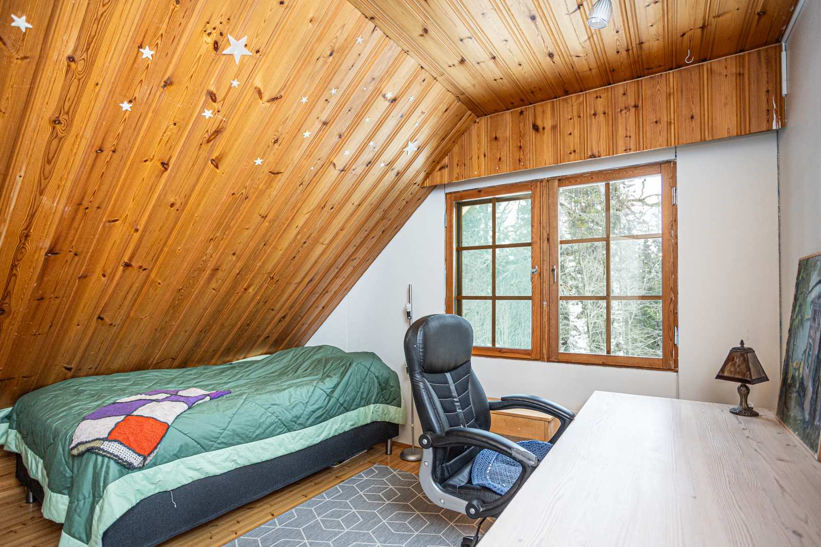 Sijainti on rauhallinen ja luonnonläheinen Lehdonkylällä, vain noin 4 km päässä keskustan palveluista. Oma 2 500 m² tontti rajoittuu metsikköön, tarjoten yksityisyyttä ja viihtyisän ympäristön.