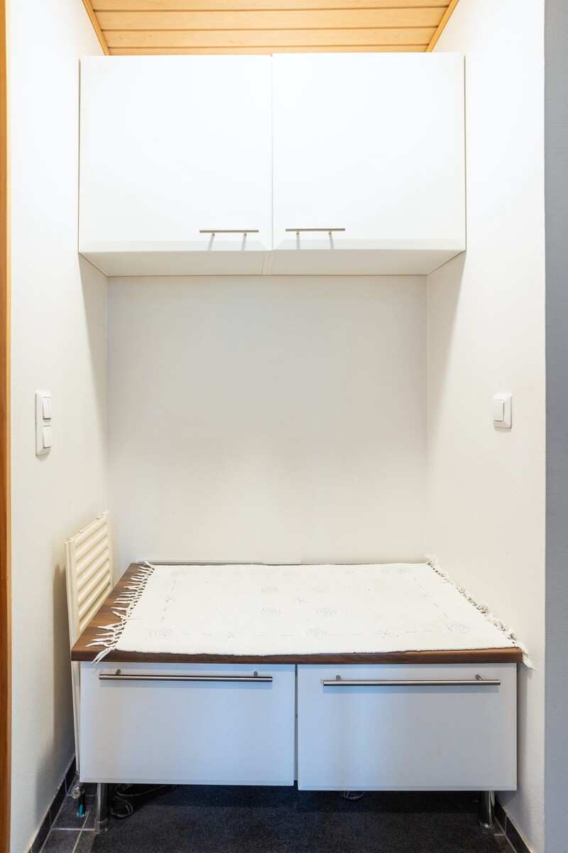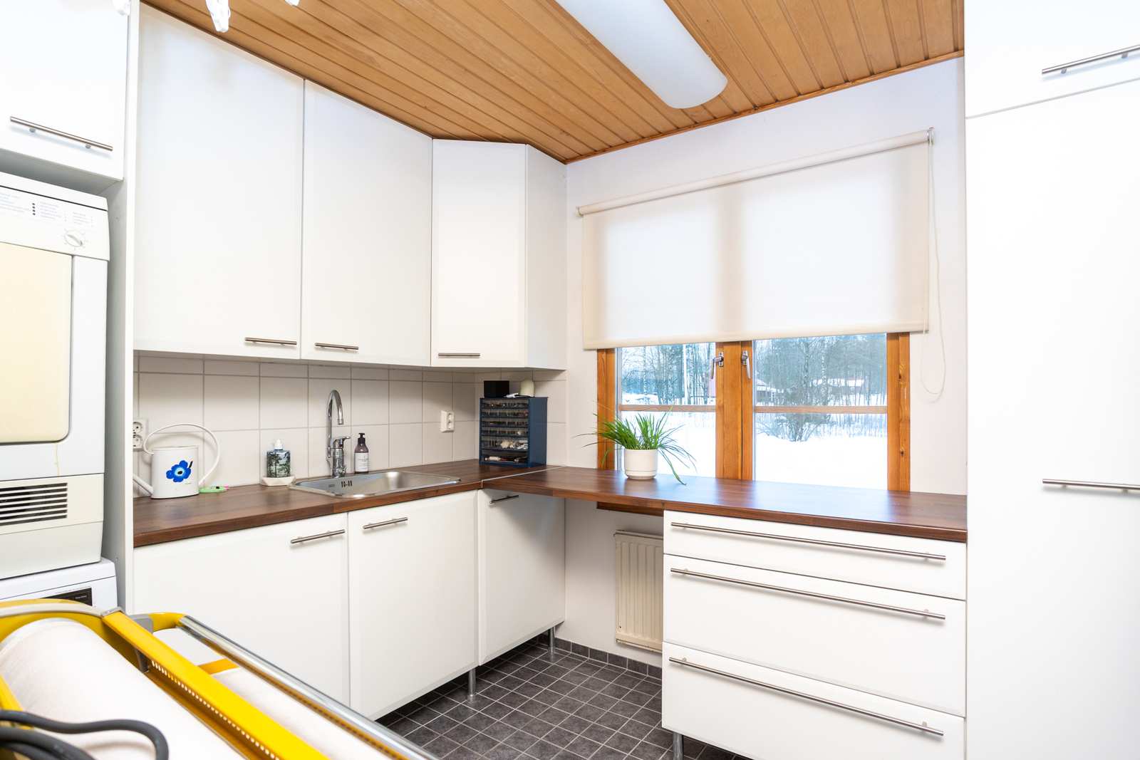 | Kodinhoitohuone | Pyykinpesukone, kuivausrumpu, lattiakaivo, kaappeja. Lattiassa laatoitus (lattialämmitys), seinissä maali, katossa paneeli. |