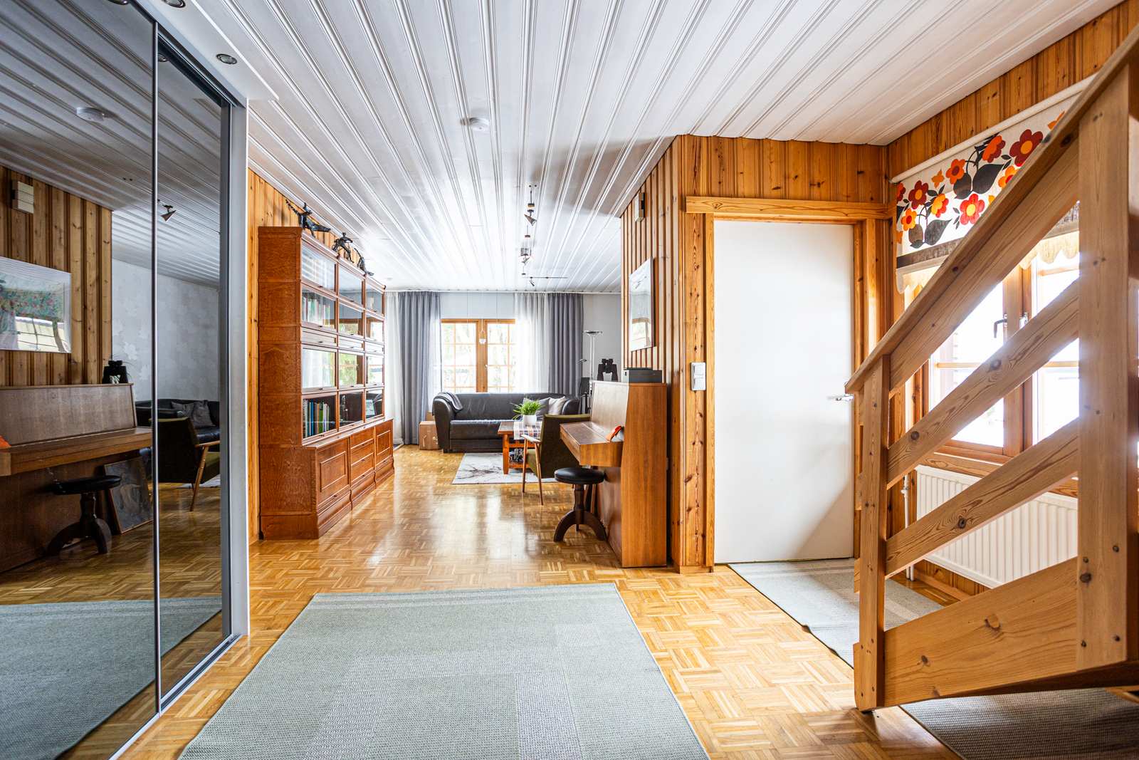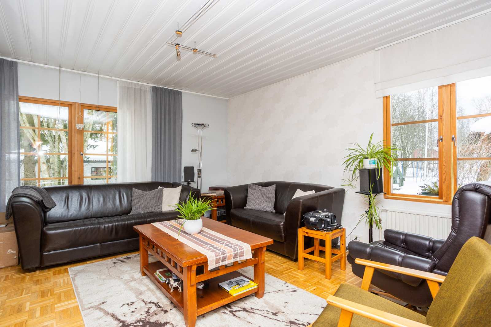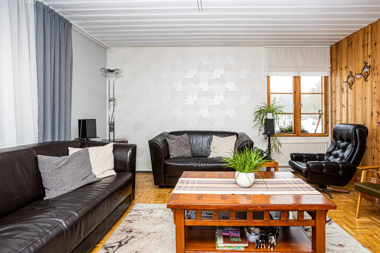 | Olohuone | Lattiassa parketti, seinissä puu/maali/tapettipintoja, katossa paneeli. |