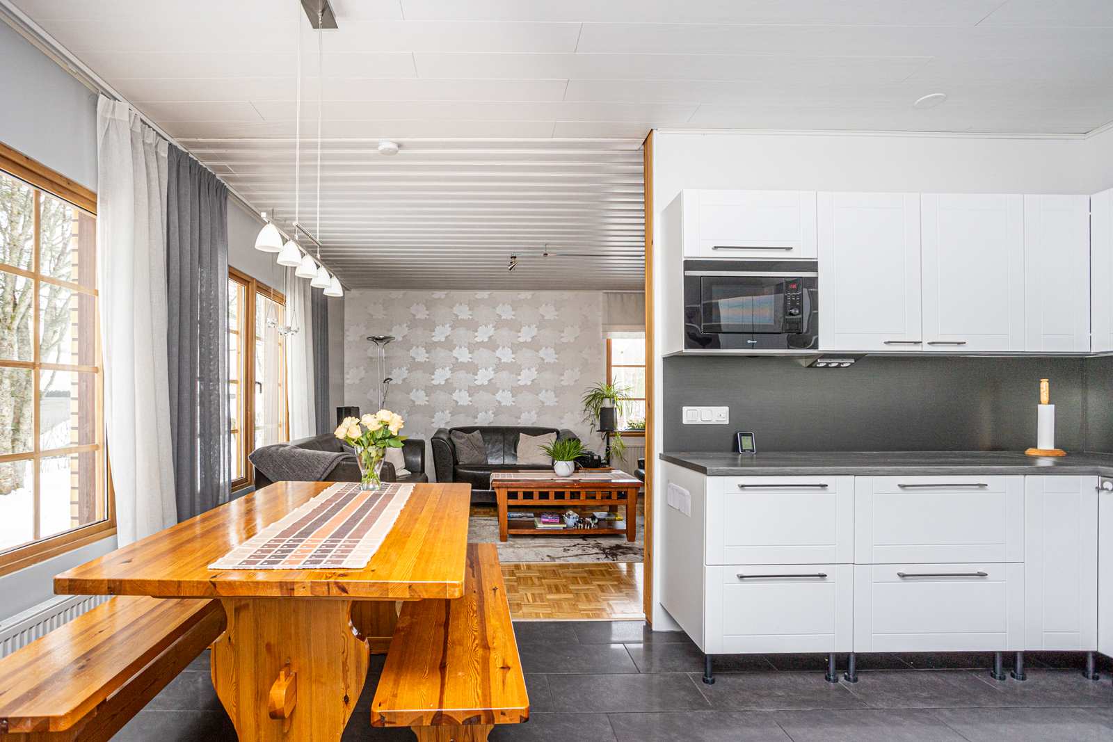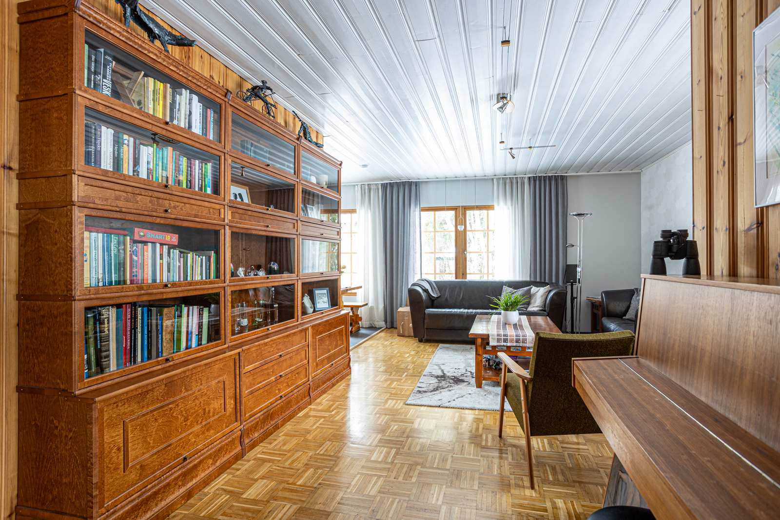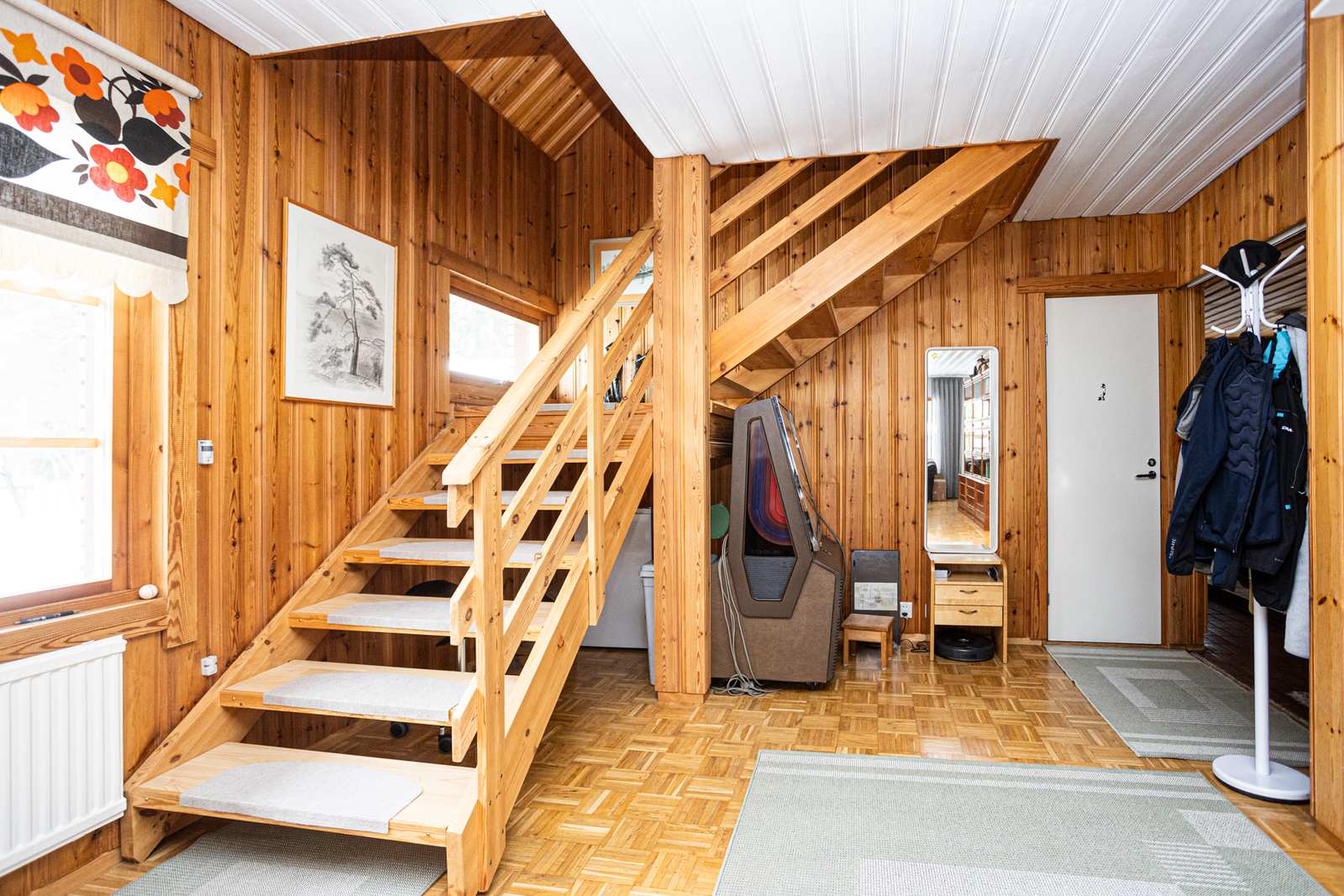 | Olohuone | Lattiassa parketti, seinissä puu/maali/tapettipintoja, katossa paneeli. |