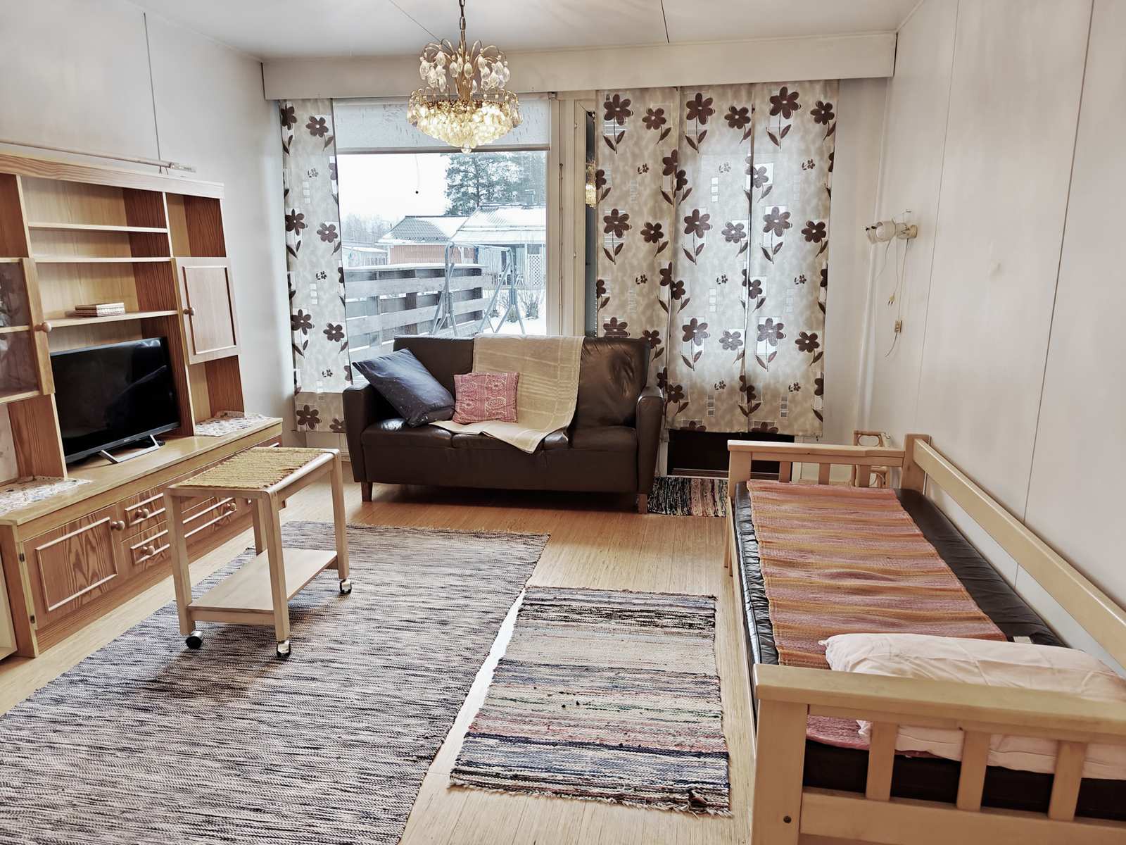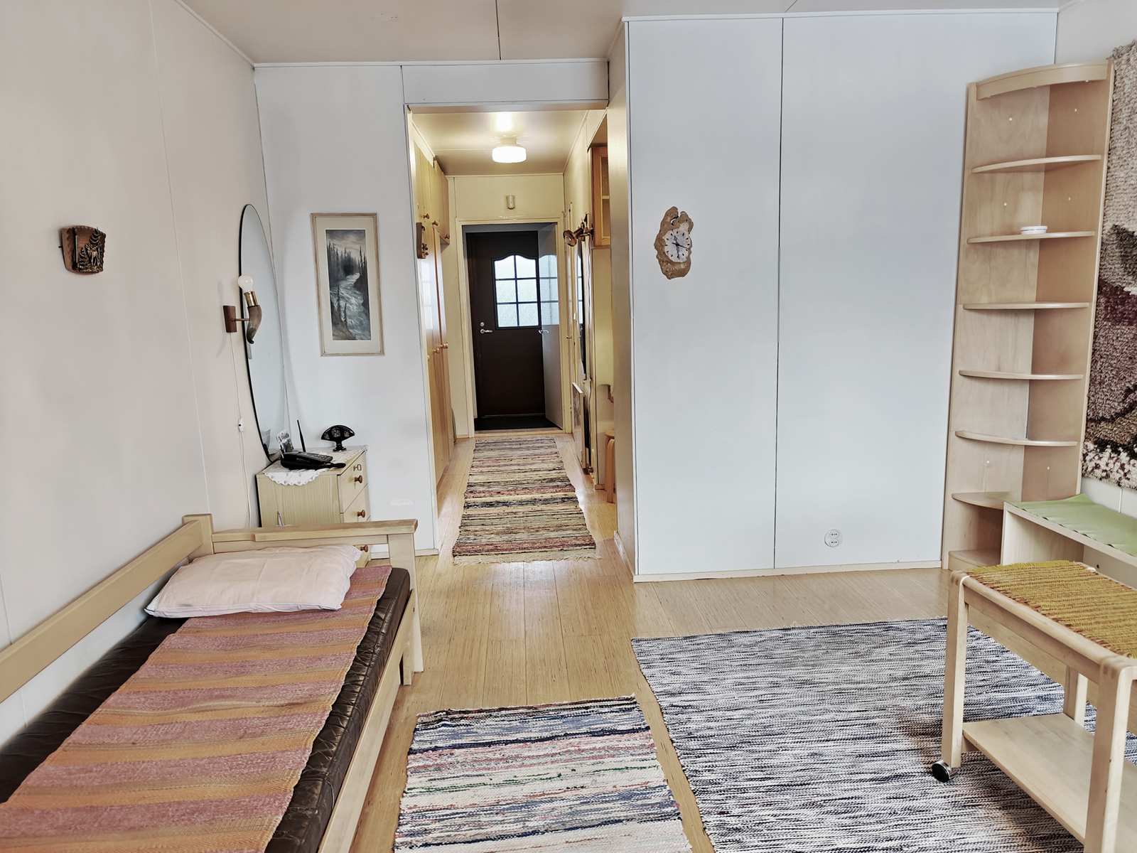 | Olohuone | Seinät ja katto maali, lattia parketti, käynti takapihalle. |